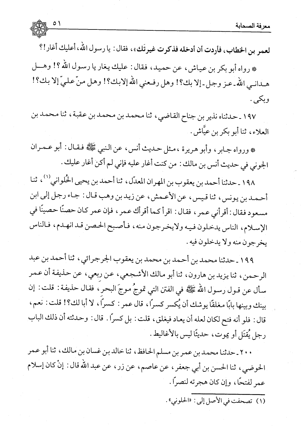 200 - حَدَّثَنَا مُحَمَّدُ بْنُ عُمَرَ بْنِ مُسْلِمٍ الْحَافِظُ، ثَنَا خَالِدُ بْنُ غَسَّانَ بْنِ مَالِكٍ، ثَنَا أَبُو عُمَرَ الْحَوْضِيُّ، ثَنَا الْحَسَنُ بْنُ أَبِي جَعْفَرٍ، عَنْ عَاصِمٍ، عَنْ زِرٍّ، عَنْ عَبْدِ اللهِ، قَالَ: «إِنْ كَانَ §إِسْلَامُ عُمَرَ لَفَتْحًا وَإِنْ كَانَ هِجْرَتُهُ لَنَصْرًا»