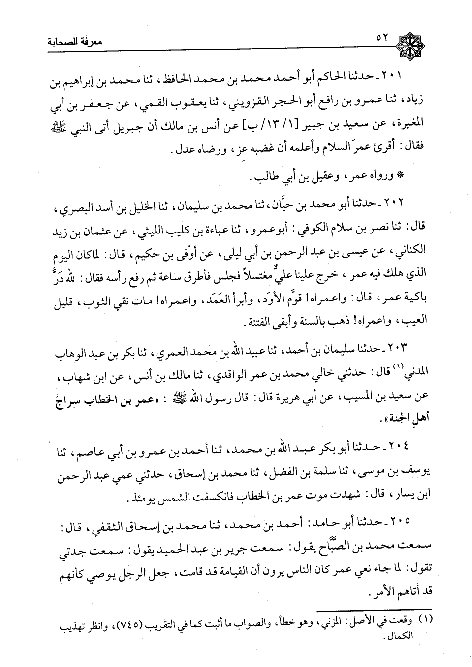 203 - حَدَّثَنَا سُلَيْمَانُ بْنُ أَحْمَدَ، ثَنَا عُبَيْدُ اللهِ بْنُ مُحَمَّدٍ الْعُمَرِيُّ، ثَنَا بَكْرُ بْنُ عَبْدِ الْوَهَّابِ الْمَدَنِيُّ، قَالَ: حَدَّثَنِي خَالِي، مُحَمَّدُ بْنُ عُمَرَ الْوَاقِدِيُّ، ثَنَا مَالِكُ بْنُ أَنَسٍ، عَنِ ابْنِ شِهَابٍ، عَنْ سَعِيدِ بْنِ الْمُسَيِّبِ، عَنْ أَبِي هُرَيْرَةَ، قَالَ: قَالَ رَسُولُ اللهِ صَلَّى اللَّهُ عَلَيْهِ وَسَلَّمَ: §«عُمَرُ بْنُ الْخَطَّابِ سِرَاجُ أَهْلِ الْجَنَّةِ»