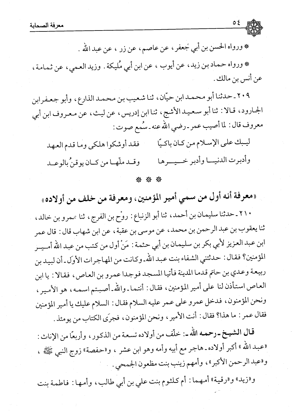 210 - حَدَّثَنَا سُلَيْمَانُ بْنُ أَحْمَدَ، ثَنَا أَبُو الزِّنْبَاعِ رَوْحُ بْنُ الْفَرَجِ، ثَنَا عَمْرُو بْنُ خَالِدٍ، ثَنَا يَعْقُوبُ بْنُ عَبْدِ الرَّحْمَنِ بْنِ مُحَمَّدٍ، عَنْ مُوسَى بْنِ عُقْبَةَ، عَنِ ابْنِ شِهَابٍ، قَالَ: قَالَ عُمَرُ بْنُ عَبْدِ الْعَزِيزِ لِأَبِي بَكْرِ بْنِ سُلَيْمَانَ بْنِ أَبِي حَثْمَةَ: مَنْ أَوَّلُ مَنْ كَتَبَ مِنْ عَبْدِ اللهِ أَمِيرِ الْمُؤْمِنِينِ، فَقَالَ: حَدَّثَتْنِي الشِّفَاءُ بِنْتُ عَبْدِ اللهِ، وَكَانَتْ مِنَ الْمُهَاجِرَاتِ الْأُوَلِ، " §أَنَّ لَبِيدَ بْنَ رَبِيعَةَ، وَعَدِيَّ بْنَ حَاتِمٍ قَدِمَا الْمَدِينَةَ، فَأَتَيَا الْمَسْجِدَ، فَوَجَدَا عَمْرَو بْنَ الْعَاصِ، فَقَالَا: يَا ابْنَ الْعَاصِ اسْتَأْذِنْ لَنَا عَلَى أَمِيرِ الْمُؤْمِنِينَ، فَقَالَ: أَنْتُمَا وَاللهِ أَصَبْتُمُ اسْمَهُ، هُوَ الْأَمِيرُ، وَنَحْنُ الْمُؤْمِنُونَ، فَدَخَلَ عَمْرٌو عَلَى عُمَرَ عَلَيْهِ السَّلَامُ، فَقَالَ: السَّلَامُ عَلَيْكَ يَا أَمِيرَ الْمُؤْمِنِينَ، فَقَالَ عُمَرُ: مَا هَذَا؟ فَقَالَ: أَنْتَ الْأَمِيرُ وَنَحْنُ الْمُؤْمِنُونَ، فَجَرَى الْكِتَابُ مِنْ يَوْمَئِذٍ " قَالَ الشَّيْخُ رَحِمَهُ اللهُ: خَلَّفَ مِنْ أَوْلَادِهِ تِسْعَةً مِنَ الذُّكُورِ وَأَرْبَعًا مِنَ الْإِنَاثِ، عَبْدُ اللهِ أَكْبَرُ أَوْلَادِهِ، هَاجَرَ مَعَ أَبِيهِ وَأُمِّهِ وَهُوَ ابْنُ عَشْرٍ، وَحَفْصَةُ زَوْجُ النَّبِيِّ صَلَّى اللَّهُ عَلَيْهِ وَسَلَّمَ، وَعَبْدُ الرَّحْمَنِ الْأَكْبَرُ وَأُمُّهُمْ زَيْنَبُ بِنْتُ مَظْعُونٍ الْجُمَحِيُّ، وَزَيْدٌ وَرُقَيَّةُ أُمُّهُمَا أُمُّ كُلْثُومٍ بِنْتُ عَلِيِّ بْنِ أَبِي طَالِبٍ، وَأُمُّهَا فَاطِمَةُ بِنْتُ -[55]- رَسُولِ اللهِ صَلَّى اللَّهُ عَلَيْهِ وَسَلَّمَ، وَزَيْدٌ الْأَصْغَرُ، وَعُبَيْدُ اللهِ أُمُّهُمَا أُمُّ كُلْثُومٍ بِنْتِ جَرْوَلٍ الْخُزَاعِيُّ، قُتِلَ عُبَيْدُ اللهِ بِصِفِّينَ مَعَ مُعَاوِيَةَ، وَعَاصِمٌ أُمُّهُ جَمِيلَةُ بِنْتُ ثَابِتِ بْنِ الْأَقْلَحِ، كَانَتْ تُسَمَّى عَاصِيَةَ، فَسَمَّاهَا رَسُولُ اللهِ صَلَّى اللَّهُ عَلَيْهِ وَسَلَّمَ جَمِيلَةَ، وَعَبْدُ الرَّحْمَنِ الْأَصْغَرُ وَهُوَ أَبُو الْمُجَبِّرِ، أُمُّهُ أُمُّ وَلَدٍ يُقَالُ لَهَا: فُكَيْهَةُ، وَأُخْتُهُ لِأُمِّهِ زَيْنَبُ بِنْتُ عُمَرَ وَعِيَاضٌ أُمُّهُ عَاتِكَةُ بِنْتُ زَيْدِ بْنِ عَمْرِو بْنِ نُفَيْلٍ وَفَاطِمَةُ أُمُّهَا أُمُّ حَكِيمٍ بِنْتُ الْحَارِثِ بْنِ هِشَامِ بْنِ الْمُغِيرَةِ، وَعَبْدُ اللهِ الْأَصْغَرُ وَأُمُّهُ سَعِيدَةُ بِنْتُ رَافِعِ بْنِ عُبَيْدِ بْنِ عَمْرٍو مِنْ بَنِي عَمْرِو بْنِ عَوْفٍ، فَهَؤُلَاءِ وَلَدُ عُمَرَ بْنِ الْخَطَّابِ رَضِيَ اللهُ عَنْهُ