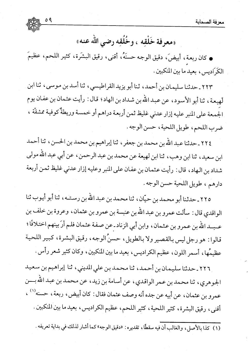 225 - حَدَّثَنَا أَبُو مُحَمَّدِ بْنُ حَيَّانَ، ثَنَا مُحَمَّدُ بْنُ عَبْدِ اللهِ بْنِ رُسْتَهْ، ثَنَا أَبُو أَيُّوبَ، ثَنَا الْوَاقِدِيُّ، قَالَ: سَأَلْتُ عَمْرَو بْنَ عَبْدِ اللهِ بْنِ عَنْبَسَةَ بْنِ عَمْرِو بْنِ عُثْمَانَ، وَعُرْوَةَ بْنَ خَلَفِ بْنِ عَبْدِ اللهِ بْنِ عَمْرِو بْنِ عُثْمَانَ، وَابْنَ أَبِي الزِّنَادِ، " عَنْ صِفَةِ، عُثْمَانَ، فَلَمْ أَرَ بَيْنَهُمُ اخْتِلَافًا، قَالُوا: §هُوَ رَجُلٌ لَيْسَ بِالْقَصِيرِ وَلَا بِالطَّوِيلِ حَسَنُ الْوَجْهِ، رَقِيقُ الْبَشَرَةِ، كَبِيرُ اللِّحْيَةِ عَظِيمُهَا، أَسْمَرُ اللَّوْنِ، عَظِيمُ الْكَرَادِيسِ بَعِيدُ مَا بَيْنَ الْمَنْكِبَيْنِ وَكَانَ كَثِيرَ شَعْرِ رَأْسٍ "