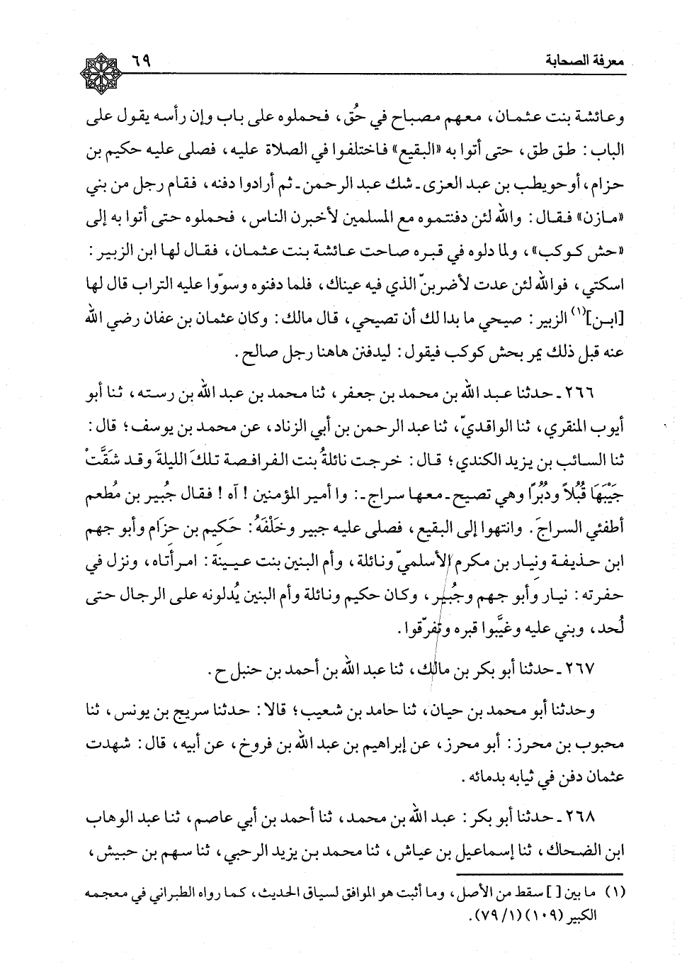 266 - حَدَّثَنَا عَبْدُ اللهِ بْنُ مُحَمَّدِ بْنِ جَعْفَرٍ، ثَنَا مُحَمَّدُ بْنُ عَبْدِ اللهِ بْنِ رُسْتَهْ، ثَنَا أَبُو أَيُّوبَ الْمِنْقَرِيُّ، ثَنَا الْوَاقِدِيُّ، ثَنَا عَبْدُ الرَّحْمَنِ بْنُ أَبِي الزِّنَادِ، عَنْ مُحَمَّدِ بْنِ يُوسُفَ، قَالَ: ثَنَا السَّائِبُ بْنُ يَزِيدَ الْكِنْدِيُّ، قَالَ: §«خَرَجَتْ نَائِلَةُ بِنْتُ الْفُرَافِصَةِ تِلْكَ اللَّيْلَةِ وَقَدْ شَقَّتْ جَيْبَهَا قُبُلًا وَدُبُرًا وَهِيَ تَصِيحُ، مَعَهَا سِرَاجٌ» وَا أَمِيرَ الْمُؤْمِنِينَ، آهٍ، فَقَالَ جُبَيْرُ بْنُ مُطْعِمٍ أَطْفِئِي السَّرَّاجَ، وَانْتَهَوْا إِلَى الْبَقِيعِ، فَصَلَّى عَلَيْهِ جُبَيْرٌ وَخَلْفَهُ حَكِيمُ بْنُ حِزَامٍ، وَأَبُو جَهْمِ بْنُ حُذَيْفَةَ وَنِيَارُ بْنُ مُكْرَمٍ الْأَسْلَمِيُّ وَنَائِلَةُ وَأُمُّ الْبَنِينَ بِنْتُ عُيَيْنَةَ امْرَأَتَاهُ، وَنَزَلَ فِي حُفْرَتِهِ نِيَارٌ، وَأَبُو جَهْمٍ، وَجُبَيْرٌ، وَكَانَ حَكِيمٌ وَنَائِلَةُ وَأُمُّ الْبَنِينَ يَدُلُّونَهُ عَلَى الرِّحَالِ حَتَّى لُحِدَ، وَبُنِيَ عَلَيْهِ وَغَيَّبُوا قَبْرَهُ وَتَفَرَّقُوا "