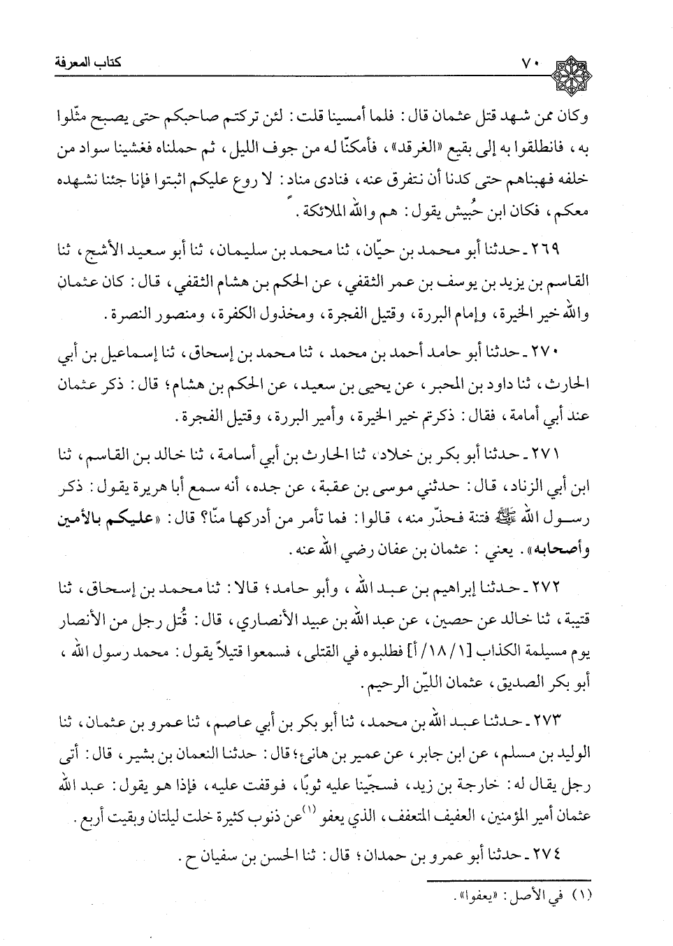 270 - حَدَّثَنَا أَبُو حَامِدٍ أَحْمَدُ بْنُ مُحَمَّدٍ، ثَنَا مُحَمَّدُ بْنُ إِسْحَاقَ، ثَنَا إِسْمَاعِيلُ بْنُ أَبِي الْحَارِثِ، ثَنَا دَاوُدُ بْنُ الْمُحَبَّرِ، عَنْ يَحْيَى بْنِ سَعِيدٍ، عَنِ الْحَكَمِ بْنِ هِشَامٍ، قَالَ: " §ذُكِرَ عُثْمَانُ عِنْدَ أَبِي أُمَامَةَ، فَقَالَ: ذَكَرْتُمْ خَيْرَ الْخِيَرَةِ، وَأَمِيرَ الْبَرَرَةِ، وَقَتِيلَ الْفَجَرَةِ "