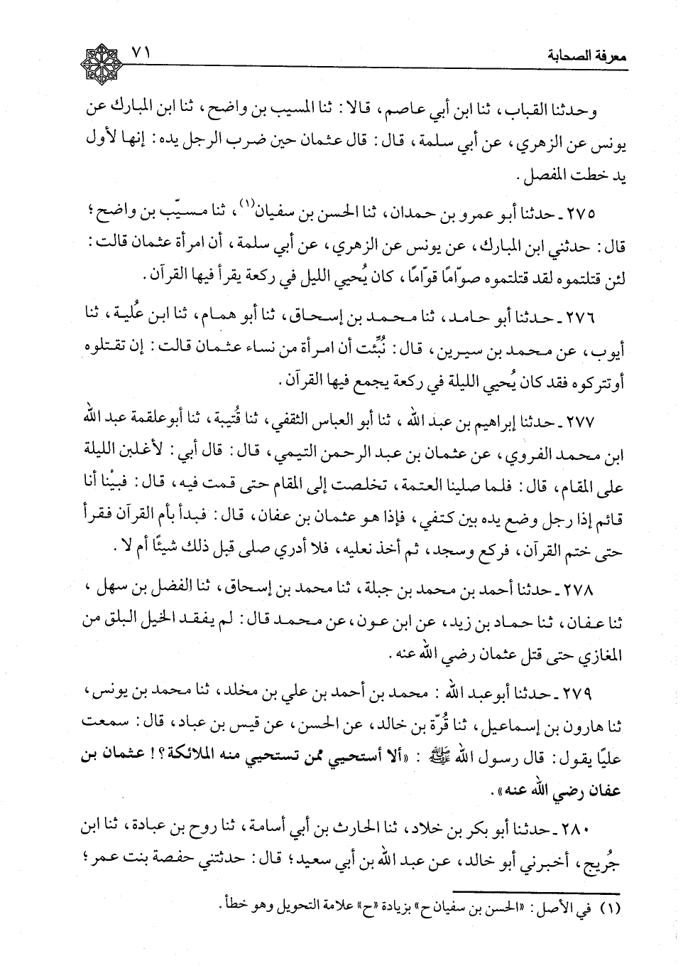 275 - حَدَّثَنَا أَبُو عَمْرِو بْنُ حَمْدَانَ، ثَنَا الْحَسَنُ بْنُ سُفْيَانَ، ثَنَا مُسَيِّبُ بْنُ وَاضِحٍ، قَالَ: حَدَّثَنِي ابْنُ الْمُبَارَكِ، عَنْ يُونُسَ، عَنِ الزُّهْرِيِّ، عَنْ أَبِي سَلَمَةَ، أَنَّ امْرَأَةَ، عُثْمَانَ قَالَتْ: «§لَئِنْ قَتَلْتُمُوهُ لَقَدْ قَتَلْتُمُوهُ صَوَّامًا قَوَّامًا، كَانَ يُحْيِي اللَّيْلَ فِي رَكْعَةٍ يَقْرَأُ فِيهَا الْقُرْآنَ»