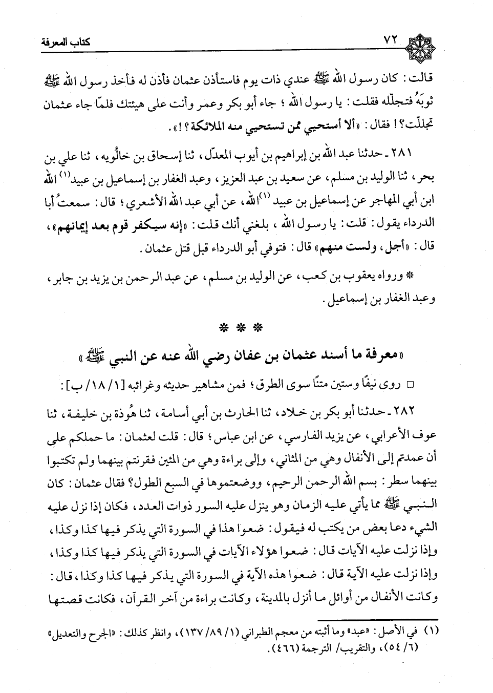§مَعْرِفَةُ مَا أَسْنَدَ عُثْمَانُ بْنُ عَفَّانَ رَضِيَ اللهُ عَنْهُ عَنِ النَّبِيِّ صَلَّى اللَّهُ عَلَيْهِ وَسَلَّمَ رَوَى نَيِّفًا وَسِتِّينَ مَتْنًا سِوَى الطُّرُقِ فَمِنْ مَشَاهِيرِ حَدِيثِهِ وَغَرَائِبِهِ