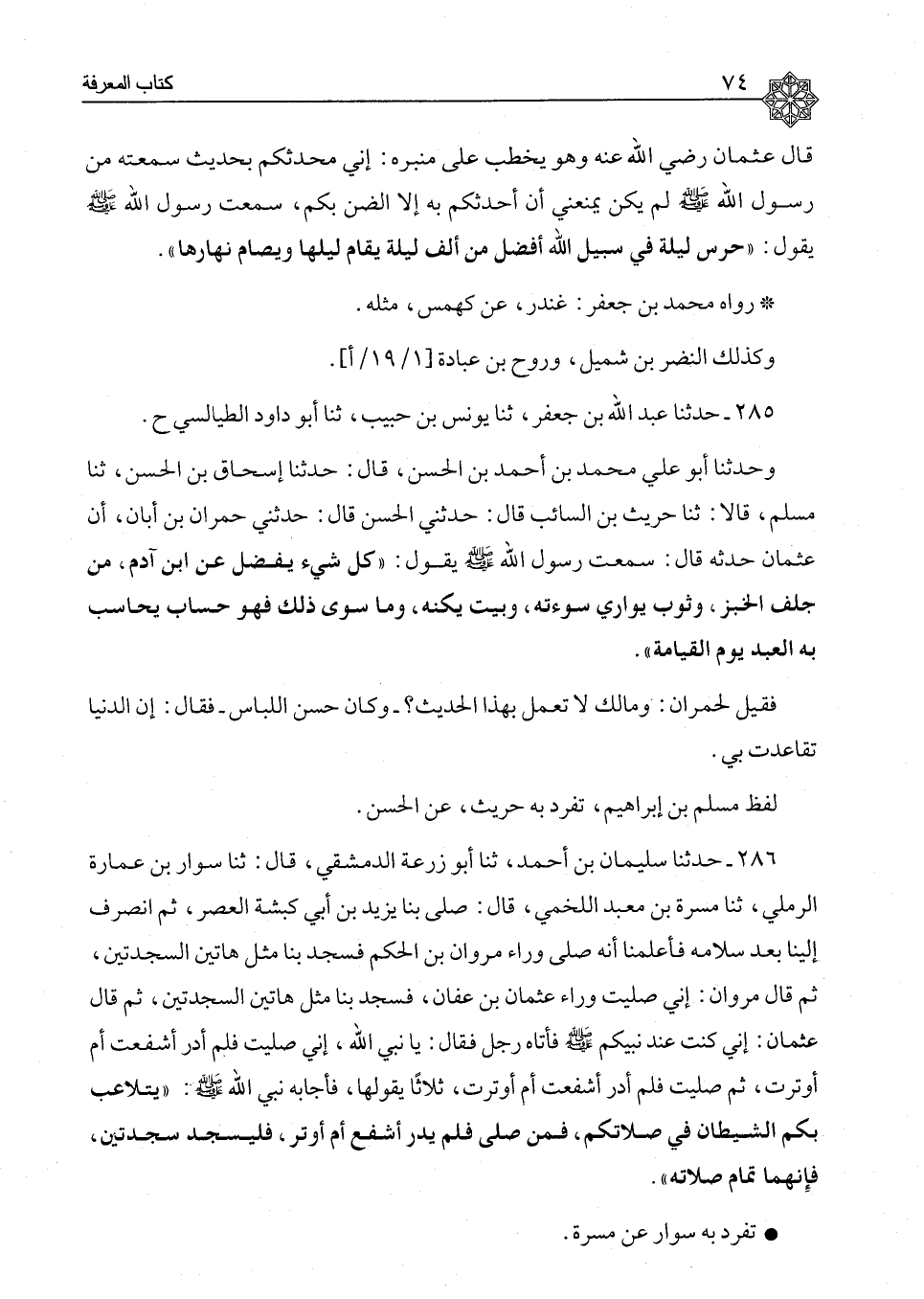 286 - حَدَّثَنَا سُلَيْمَانُ بْنُ أَحْمَدَ، ثَنَا أَبُو زُرْعَةَ الدِّمَشْقِيُّ، قَالَ: ثَنَا سَوَّارُ بْنُ عُمَارَةَ الرَّمْلِيُّ، ثَنَا مَسَرَّةُ بْنُ مَعْبَدٍ اللَّخْمِيُّ، قَالَ: صَلَّى بِنَا يَزِيدُ بْنُ أَبِي كَبْشَةَ الْعَصْرَ ثُمَّ انْصَرَفَ إِلَيْنَا بَعْدَ سَلَامِهِ، فَأَعْلَمَنَا أَنَّهُ صَلَّى وَرَاءَ مَرْوَانَ بْنِ الْحَكَمِ فَسَجَدَ بِنَا مِثْلَ هَاتَيْنِ السَّجْدَتَيْنِ، ثُمَّ قَالَ مَرْوَانُ: إِنِّي صَلَّيْتُ وَرَاءَ عُثْمَانَ بْنَ عَفَّانَ فَسَجَدَ بِنَا مِثْلَ هَاتَيْنِ السَّجْدَتَيْنِ، ثُمَّ قَالَ عُثْمَانُ: إِنِّي كُنْتُ عِنْدَ نَبِيِّكُمْ صَلَّى اللَّهُ عَلَيْهِ وَسَلَّمَ فَأَتَاهُ رَجُلٌ فَقَالَ: يَا نَبِيَّ اللهِ إِنِّي صَلَّيْتُ فَلَمْ أَدْرِ أَشَفَعْتُ أَمْ أَوْتَرْتُ، ثُمَّ صَلَّيْتُ فَلَمْ أَدْرِ أَشَفَعْتُ أَمْ أَوْتَرْتُ، ثَلَاثًا يَقُولُهَا، فَأَجَابَهُ نَبِيُّ اللهِ صَلَّى اللَّهُ عَلَيْهِ وَسَلَّمَ: «§يَتَلَاعَبُ بِكُمُ الشَّيْطَانُ فِي صَلَاتِكُمْ، فَمَنْ صَلَّى فَلَمْ يَدْرِ أَشْفَعَ أَمْ أَوْتَرَ فَلْيَسْجُدْ سَجْدَتَيْنِ؛ فَإِنَّهُمَا تَمَامُ صَلَاتِهِ» تَفَرَّدَ بِهِ سَوَّارٌ عَنْ مَسَرَّةَ، -[75]- رَوَاهُ يَحْيَى بْنُ مَعِينٍ، وَزِيَادُ بْنُ أَيُّوبَ، وَأَبُو عُمَيْرِ بْنُ النَّحَّاسِ، عَنْ سَوَّارٍ، عَنْ مَسَرَّةَ وَهُوَ حَدِيثُ سَوَّارٍ