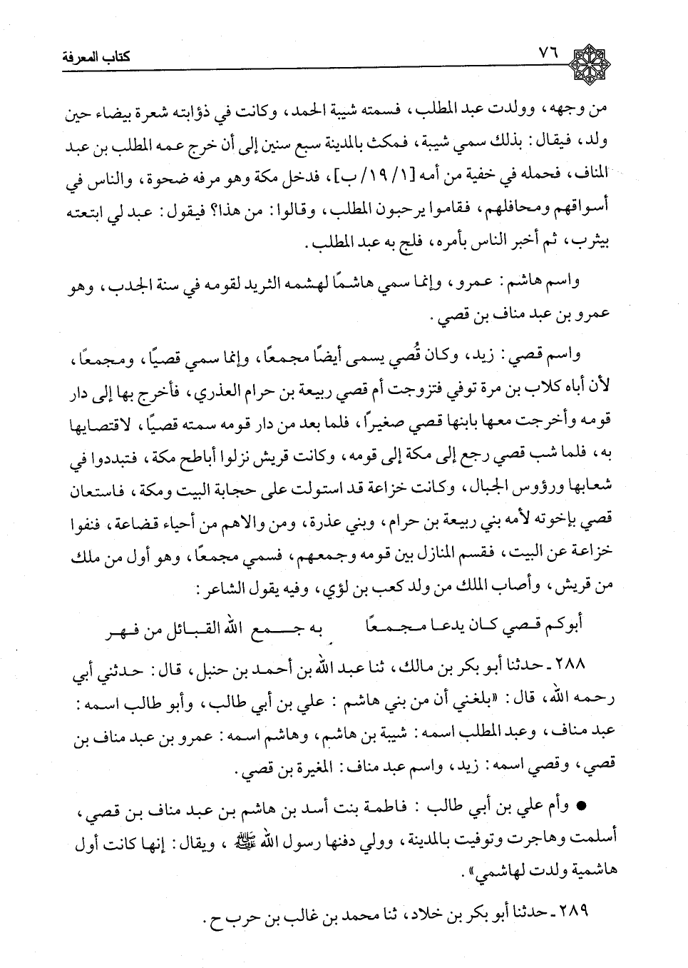 288 - حَدَّثَنَا أَبُو بَكْرِ بْنُ مَالِكٍ، ثَنَا عَبْدُ اللهِ بْنُ أَحْمَدَ بْنِ حَنْبَلٍ، قَالَ: حَدَّثَنِي أَبِي رَحِمَهُ اللهُ، قَالَ: بَلَغَنِي «أَنَّ §مِنْ بَنِي هَاشِمٍ، عَلِيَّ بْنَ أَبِي طَالِبٍ، وَأَبُو طَالِبٍ اسْمُهُ عَبْدُ مَنَافٍ، وَعَبْدُ الْمُطَّلِبِ اسْمُهُ شَيْبَةُ بْنُ هَاشِمٍ، وَهَاشِمٌ اسْمُهُ عَمْرُو بْنُ عَبْدِ مَنَافِ بْنِ قُصَيٍّ، وَقُصَيُّ اسْمُهُ زَيْدٌ، وَاسْمُ عَبْدِ مَنَافٍ، الْمُغِيرَةُ بْنُ قُصَيٍّ. وَأُمُّ عَلِيِّ بْنِ أَبِي طَالِبٍ فَاطِمَةُ بِنْتُ أَسَدِ بْنِ هَاشِمِ بْنِ عَبْدِ مَنَافِ بْنِ قُصَيٍّ، أَسْلَمَتْ وَهَاجَرَتْ وَتُوُفِّيَتْ بِالْمَدِينَةِ، وَوَلِيَ دَفْنَهَا رَسُولُ اللهِ صَلَّى اللَّهُ عَلَيْهِ وَسَلَّمَ، وَيُقَالُ إِنَّهَا كَانَتْ أَوَّلَ هَاشِمِيَّةٍ وَلَدَتْ لِهَاشِمِيٍّ»
