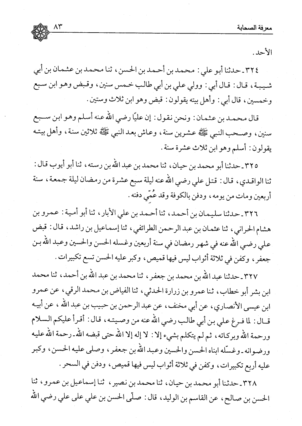 325 - حَدَّثَنَا أَبُو مُحَمَّدِ بْنُ حَيَّانَ، ثَنَا مُحَمَّدُ بْنُ عَبْدِ اللهِ بْنِ رُسْتَهْ، ثَنَا أَبُو أَيُّوبَ، قَالَ: ثَنَا الْوَاقِدِيُّ، قَالَ: §«قُتِلَ عَلِيٌّ رَضِيَ اللهُ عَنْهُ لَيْلَةَ سَبْعَ عَشْرَةَ مِنْ رَمَضَانَ لَيْلَةَ جُمُعَةٍ سَنَةَ أَرْبَعِينَ، وَمَاتَ مِنْ يَوْمِهِ، وَدُفِنَ بِالْكُوفَةِ، وَقَدْ عُمِّيَ دَفْنُهُ»
