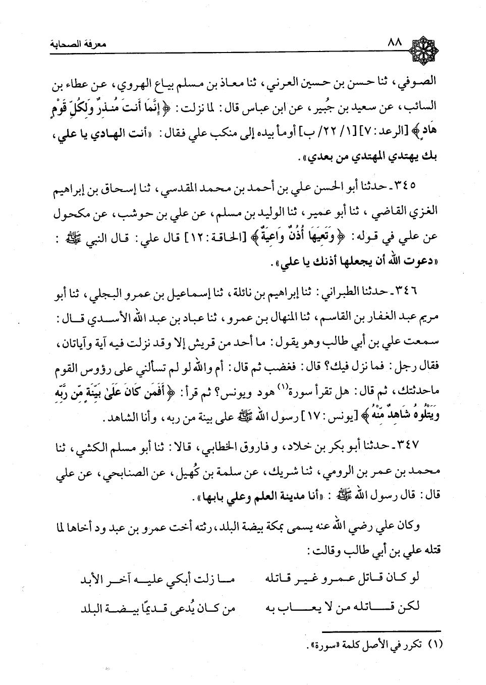 347 - حَدَّثَنَا أَبُو بَكْرِ بْنُ خَلَّادٍ، وَفَارُوقٌ الْخَطَّابِيُّ، قَالَا: ثَنَا أَبُو مُسْلِمٍ الْكَشِّيُّ، ثَنَا مُحَمَّدُ بْنُ عُمَرَ بْنِ الرُّومِيِّ، ثَنَا شَرِيكٌ، عَنْ سَلَمَةَ بْنِ كُهَيْلٍ، عَنِ الصُّنَابِحِيِّ، عَنْ عَلِيٍّ، قَالَ: قَالَ رَسُولُ اللهِ صَلَّى اللَّهُ عَلَيْهِ وَسَلَّمَ: «§أَنَا مَدِينَةُ الْعِلْمِ وَعَلِيٌّ بَابُهَا» وَكَانَ عَلِيٌّ رَضِيَ اللهُ عَنْهُ يُسَمَّى بِمَكَّةَ بَيْضَةَ الْبَلَدِ، رَثَتْ أُخْتُ عَمْرِو بْنِ عَبْدِ وُدٍّ أَخَاهَا لَمَّا قَتَلَهُ عَلِيُّ بْنُ أَبِي طَالِبٍ وَقَالَتْ: