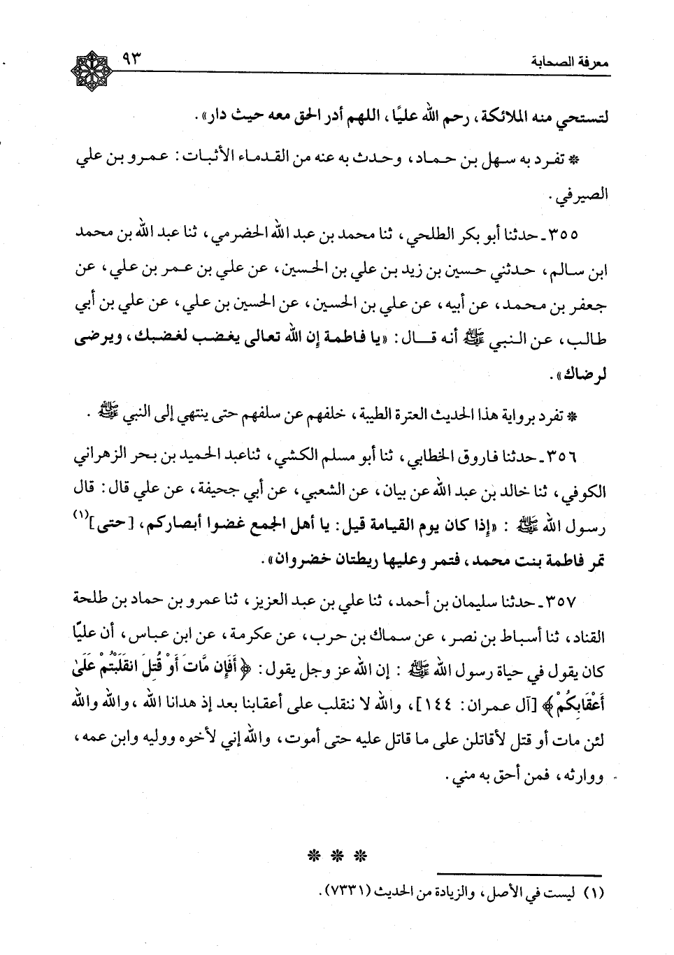355 - حَدَّثَنَا أَبُو بَكْرٍ الطَّلْحِيُّ، ثَنَا مُحَمَّدُ بْنُ عَبْدِ اللهِ الْحَضْرَمِيُّ، ثَنَا عَبْدُ اللهِ بْنُ مُحَمَّدِ بْنِ سَالِمٍ، حَدَّثَنَا حُسَيْنُ بْنُ زَيْدِ بْنِ عَلِيِّ بْنِ الْحُسَيْنِ، عَنْ عَلِيِّ بْنِ عُمَرَ بْنِ عَلِيٍّ، عَنْ جَعْفَرِ بْنِ مُحَمَّدٍ، عَنْ أَبِيهِ، عَنْ عَلِيِّ بْنِ الْحُسَيْنِ، عَنِ الْحُسَيْنِ بْنِ عَلِيٍّ، عَنْ عَلِيِّ بْنِ أَبِي طَالِبٍ، عَنِ النَّبِيِّ صَلَّى اللَّهُ عَلَيْهِ وَسَلَّمَ أَنَّهُ قَالَ: «§يَا فَاطِمَةُ، إِنَّ اللهَ تَعَالَى يَغْضَبُ لِغَضَبِكِ وَيَرْضَى لِرِضَاكِ» تَفَرَّدَ بِرِوَايَةِ هَذَا الْحَدِيثِ الْعِتْرَةُ الطَّيِّبَةُ خَلَفُهُمْ عَنْ سَلَفِهِمْ حَتَّى يَنْتَهِيَ إِلَى النَّبِيِّ صَلَّى اللَّهُ عَلَيْهِ وَسَلَّمَ