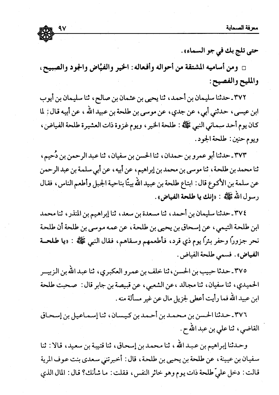 372 - حَدَّثَنَا سُلَيْمَانُ بْنُ أَحْمَدَ، ثَنَا يَحْيَى بْنُ عُثْمَانَ بْنِ صَالِحٍ، ثَنَا سُلَيْمَانُ بْنُ أَيُّوبَ بْنِ عِيسَى، حَدَّثَنِي أَبِي، عَنْ جَدِّي، عَنْ مُوسَى بْنِ طَلْحَةَ بْنِ عُبَيْدِ اللهِ، عَنْ أَبِيهِ، قَالَ: §«لَمَّا كَانَ يَوْمُ أُحُدٍ سَمَّانِي النَّبِيُّ صَلَّى اللَّهُ عَلَيْهِ وَسَلَّمَ طَلْحَةَ الْخَيْرِ، وَيَوْمُ غَزْوَةِ ذَاتِ الْعَشِيرَةِ طَلْحَةَ الْفَيَّاضِ، وَيَوْمُ حُنَيْنٍ طَلْحَةُ الْجُودِ»