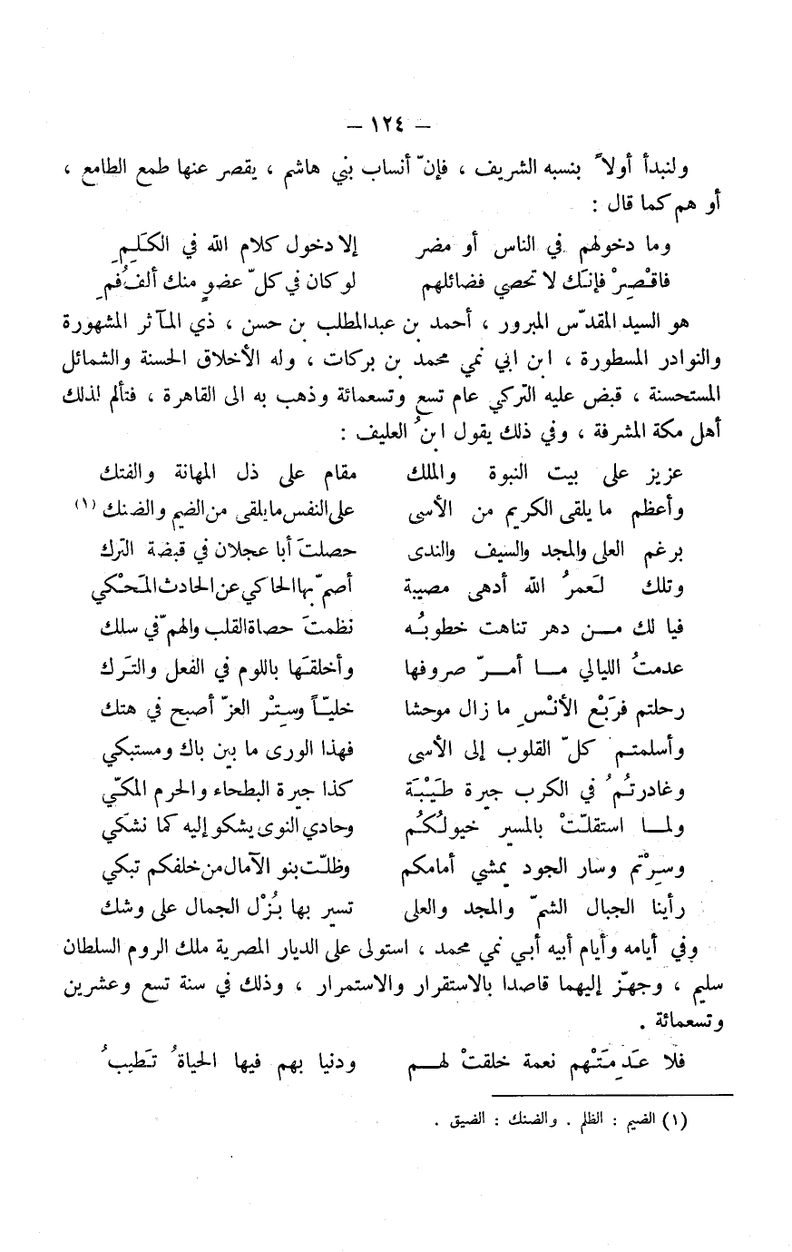 والنوادر المسطورة، ابن أبي نمي محمد بن بركات، وله الأخلاق الحسنة والشمائل المستحسنة، قبض عليه التركي عام تسع وتسعمائة وذهب به إلى القاهرة، فتألم لذلك أهل مكة المشرفة، وفي ذلك يقول ابن العليف:
