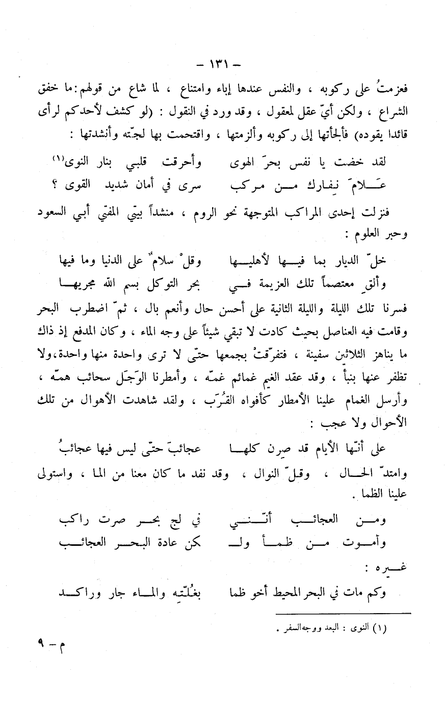 فعزمت على ركوبه والنفس عندها إباء وامتناع، لما شاع من قولهم ما خفق الشراع، ولكن أي عقل لمعقول، وقد ورد في النقول: لو كشف لأحدكم لرأى قائداً يقوده، فألجأتها إلى ركوبه وألزمتها، واقتحمت بها لجته وأنشدتها: