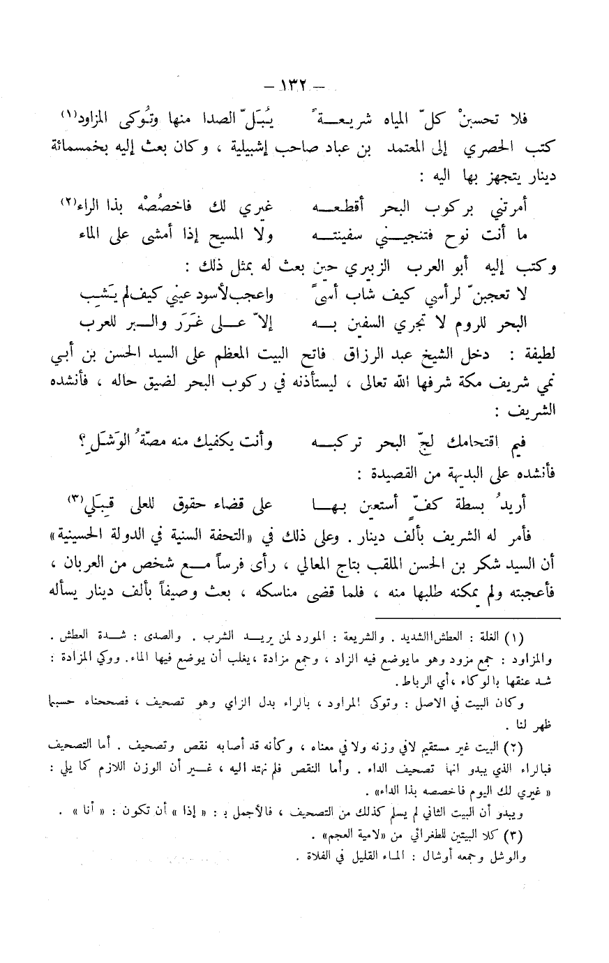 فأمر له الشريف بألف دينار. وعلى ذلك في التحفة السنية في الدولة الحسينية أن السيد شكر بن الحسن الملقب بتاج المعالي رأى فرساً مع شخص من العربان، فأعجبته ولم يمكنه طلبها منه، فلما قضى مناسكه بعث وصيفاً بألف دينار يسأله