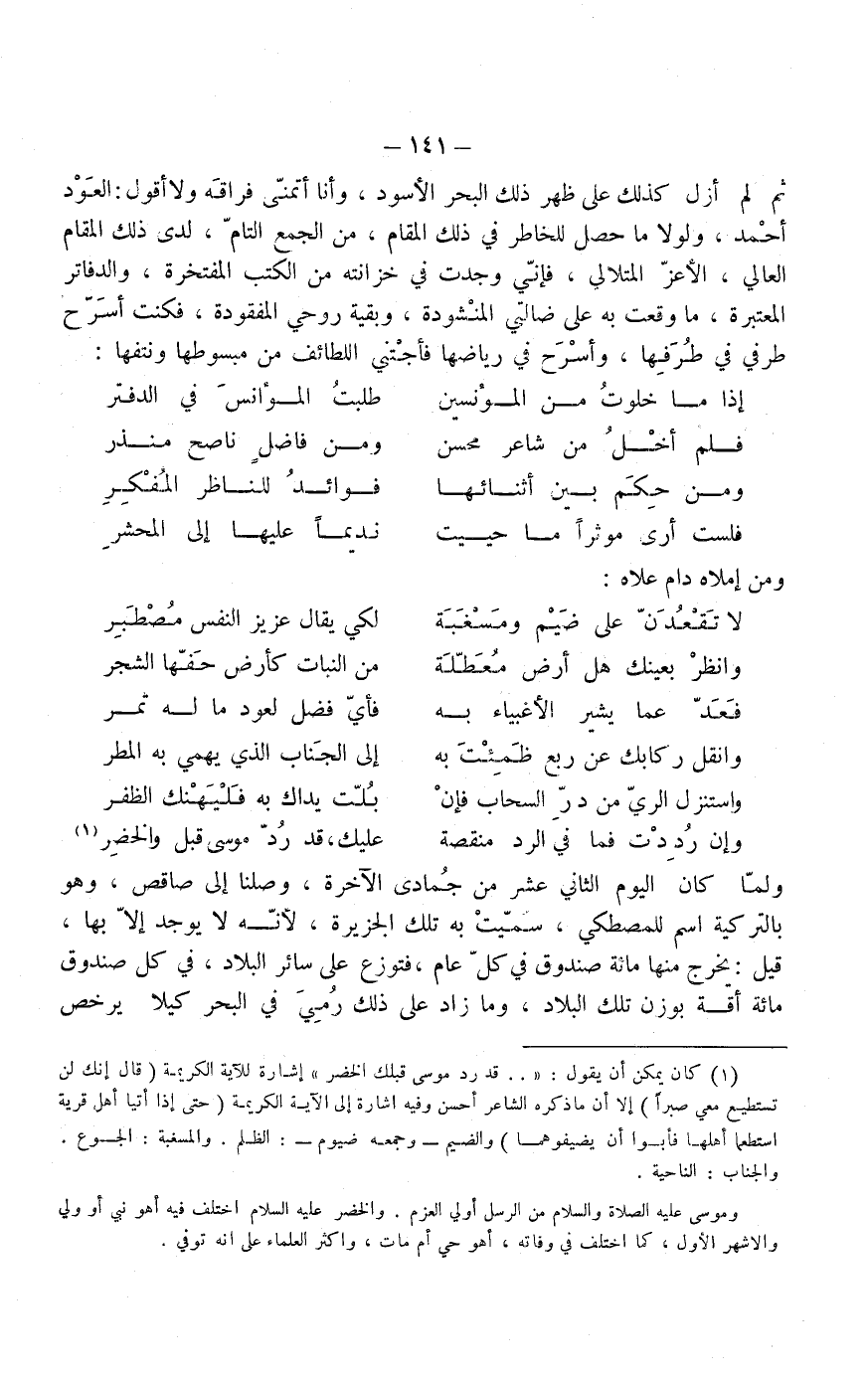 ثم لم أزل كذلك على ظهر ذلك البحر الأسود، وأنا أتمنى فراقه ولا أقول العود أحمد ولولا ما حصل للخاطر في ذلك المقام من الجمع التام، لدى ذلك المقام العالي الأعز المتلالي، فإني وجدت في خزانته من الكتب المفتخرة، والدفاتر المعتبرة، ما وقعت به على ضالتي المنشودة، وبقية روحي المفقودة، فكنت أسرّح