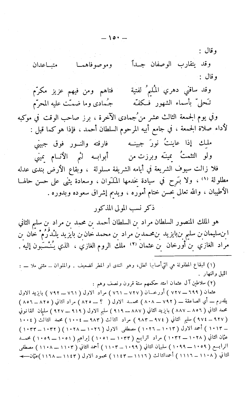 فلا زالت سيوف الشريعة في أيامه الشريفة مسلولة، وبقاع الأرض بندى عدله مطلولة، ولا برح في سيادة يخدمها المَلَوان، وسعادة يثنى على حسن حالها الأطيبان، والله تعالى يحسن ختام أموره، ويديم إشراق سعوده وبدوره.