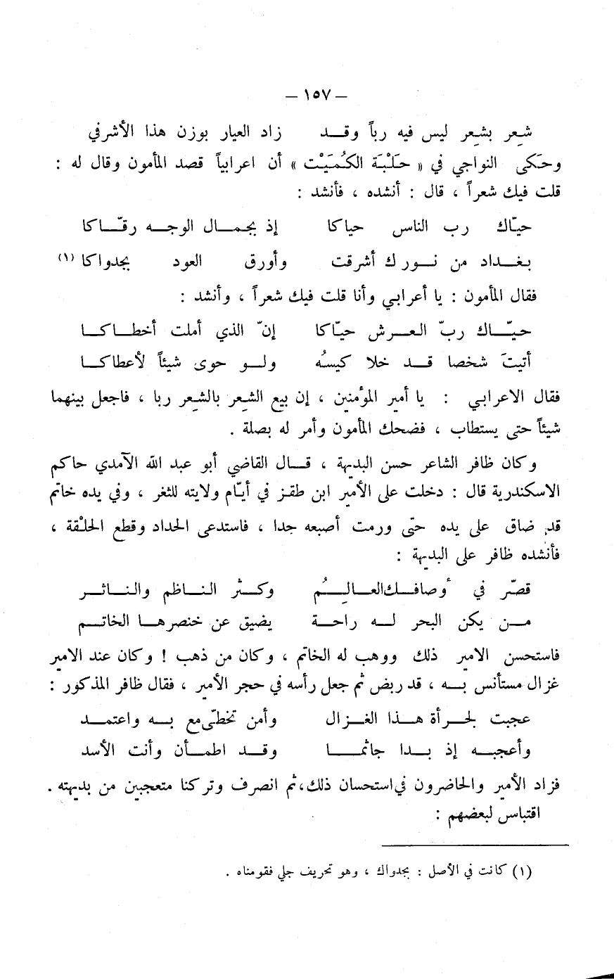 وحكى النواجي في حَلْبَة الكُمَيْت أن أعرابياً قصد المأمون وقال له: قلت فيك