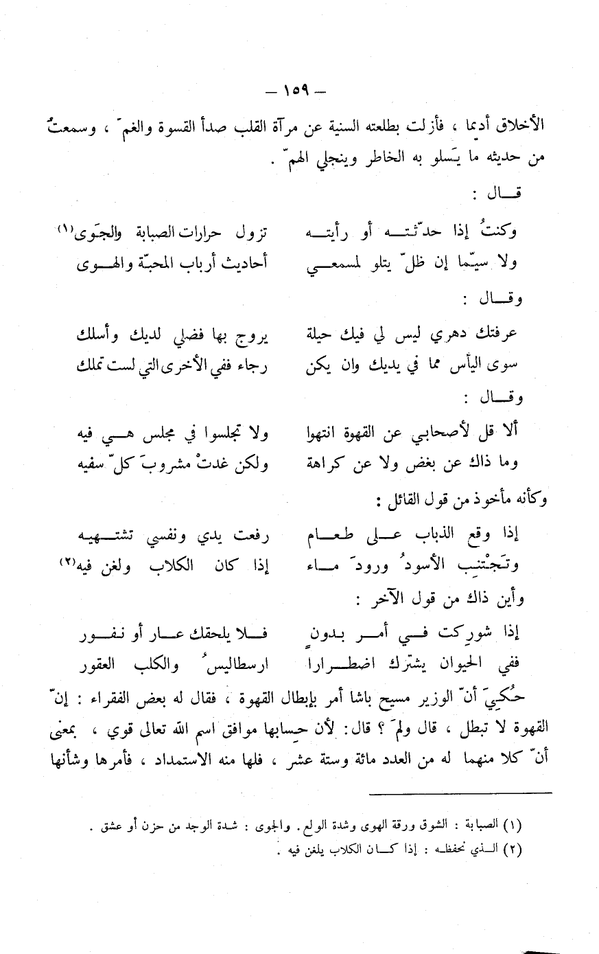 ألا قل لأصحابي عن القهوة انتهوا ... ولا تجلسوا في مجلس هي فيهِ