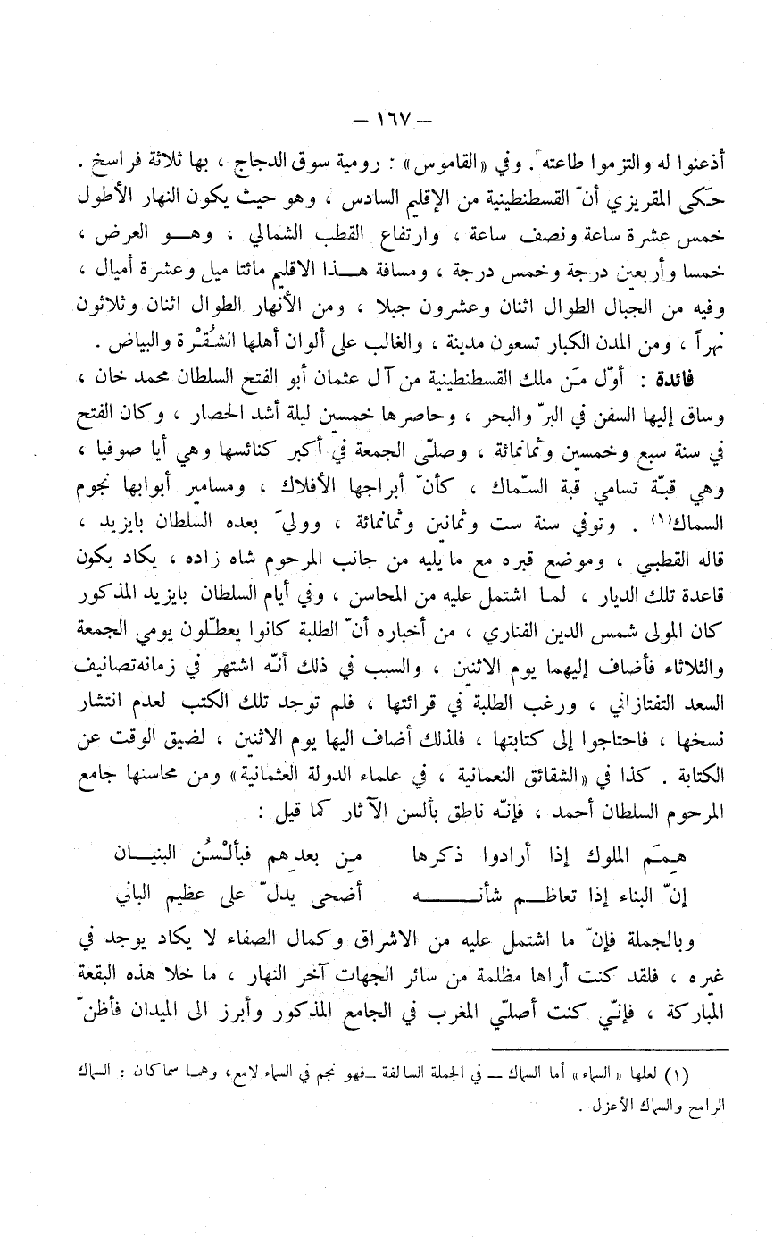 وفي القاموس: رومية سوق الدجاج بها ثلاثة فراسخ، حكى المقريزي أن القسطنطينية من الإقليم السادس، وهو حيث يكون النهار الأطول خمس عشرة ساعة ونصف ساعة، وارتفاع القطب الشمالي، وهو العرض خمساً وأربعين درجة وخمس درجة، ومسافة هذا الإقليم مائتا ميل وعشرة أميال، وفيه من الجبال الطوال اثنان وعشرون جبلاً، ومن الأنهار الطوال اثنان وثلاثون نهراً، ومن المدن الكبار تسعون مدينة، والغالب على ألوان أهلها الشُقْرة والبياض.