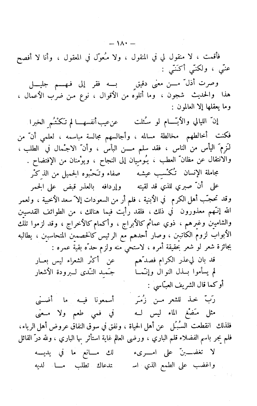 وقد تحجب أهل الكرم في الأبنية، فلم أر من السعودات إلا سعد الأخبية، ولعمر الله إنهم معذورون في ذلك، فلقد رأيت فيما هنالك من الطوائف القدسيين والشاميين، وغيرهم ذوي عمائم كالأبراج، وأكمام كالأخراج، وقد لزموا تلك الأبواب لزوم الكاتبين، وصار أحدهم مع الرئيس كالخصمين المتحاسبين، يطالبه بجائزة شعر، لو شعر بحقيقة أمره، لاستحيا منه ولزم حده بقية عمره.