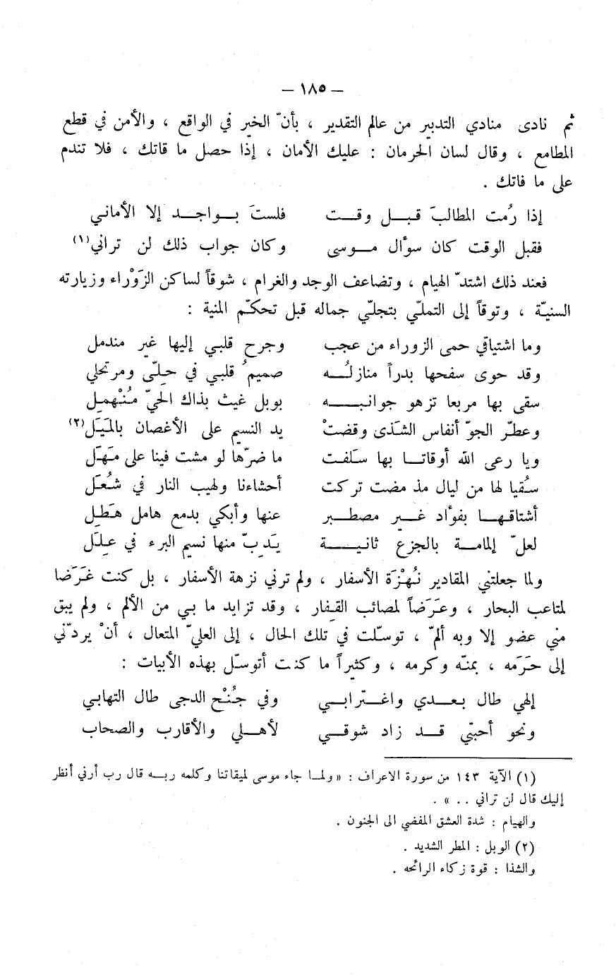 ولما جعلتني المقادير نُهْزَة الأسفار، ولم تُرِني نزهة الأسفار، بل كنت غرضاً لمتاعب البحار، وعرضاً لمصائب القفار، وقد تزايد ما بي من الألم، ولم يبق مني عضو إلا وبه ألم، توسلت في تلك الحال، إلى العليّ المتعال، أن يردّني إلى حَرَمه بمنّه وكرمه، وكثيراً ما كنت أتوسل بهذه الأبيات: