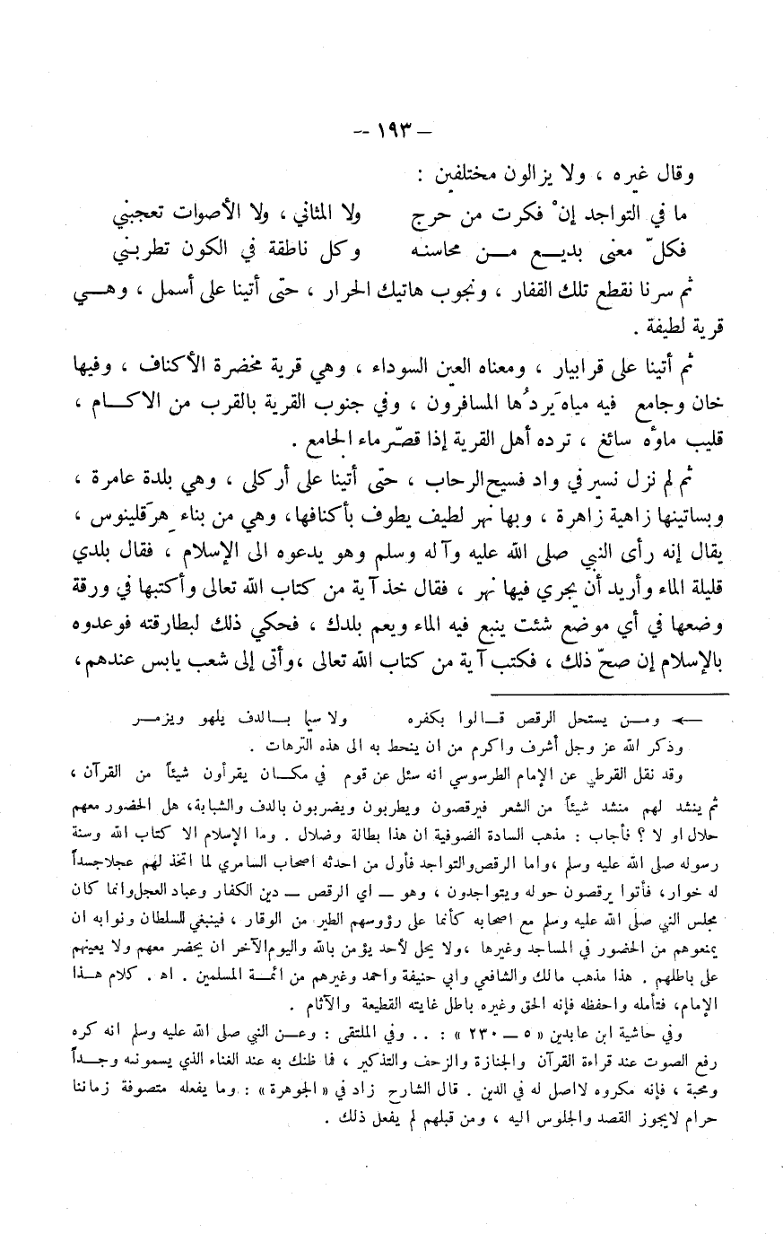 ثم لم نزل نسير في واد فسيح الرحاب، حتى أتينا على أركلى وهي بلدة عامرة، وبساتينها زاهية زاهرة، وبها نهر لطيف يطوف بأكنافها، وهي من بناء هِرَقلينوس، يقال إنه رأى النبي صلى الله عليه وسلم وهو يدعوه إلى الإسلام، فقال: بلدي قليلة الماء وأريد أن يجري فيها نهر، فقال: خذ آية من كتاب الله تعالى وأكتبها في ورقة وضعها في أي موضع شئت ينبع فيه الماء ويعم بلدك، فحكى ذلك لبطارقته فوعدوه بالإسلام إن صح ذلك، فكتب آية من كتاب الله تعالى، وأتى إلى شعب يابس عندهم