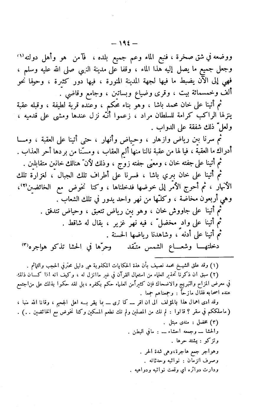 ووضعه في شق صخرة، فنبع الماء وعمّ جميع بلده، فآمن هو وأهل دولته، وجعل جميع ما يصل إليه هذا الماء وقفاً على مدينة النبي صلى الله عليه وسلم، فهي إلى الآن يضبط ما فيها لجهة المدينة المنورة، فيها دور كثيرة، وحولها نحو ألف وخمسمائة بيت، وقرى وضياع وبساتين، وجامع وقاضي.