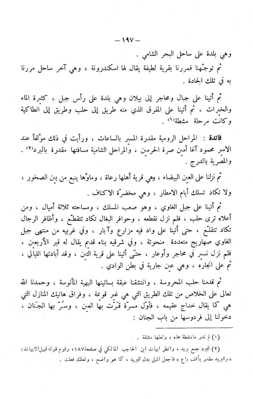 المراحل الرومية مقدرة المسير بالساعات، ورأيت في ذلك مؤلفاً عند الأمير محمود آغا أمين صرة الحرمين، والمراحل الشامية مسافتها مقدرة بالبرد،