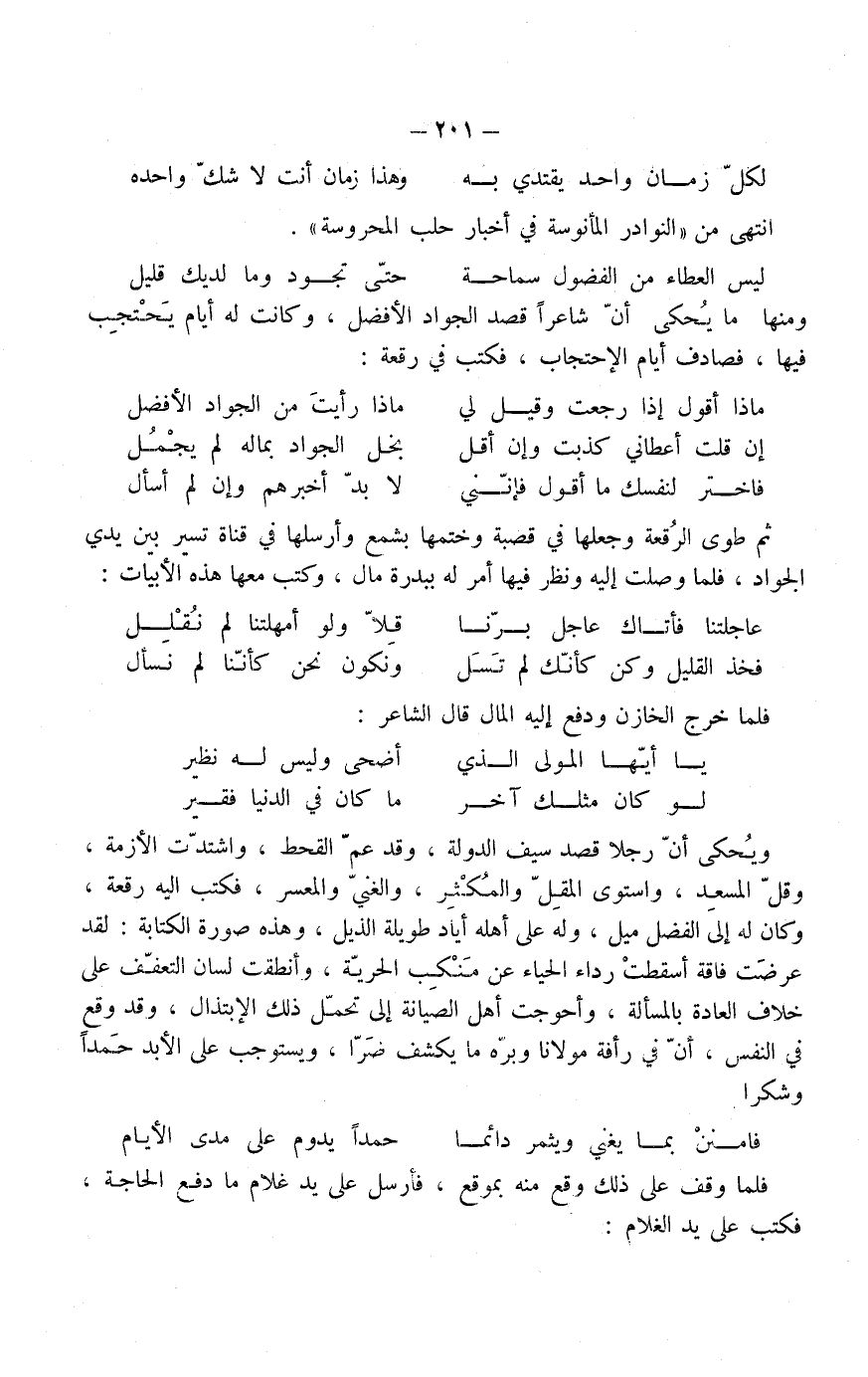 ويحكى أن رجلاً قصد سيف الدولة وقد عمّ القحط، واشتدت الأزمة وقلّ المسعِد، واستوى المُقِلّ والمُكْثِر، والغني والمعسر، فكتب إليه رقعة وكان له إلى الفضل ميل، وله على أهله أيادٍ طويلة الذيل، وهذه صورة الكتابة: لقد عرضت فاقة أسقطتْ رداء الحياء عن منكب الحريّة، وأنطقت لسان التعفّف على خلاف العادة بالمسألة، وأحوجت أهل الصيانة إلى تحمّل ذلك الابتذال، وقد وقع في النفس أن في رأفة مولانا وبِرّه ما يكشف ضَرّاً، ويستوجب على الأبد حمداً وشكراً.