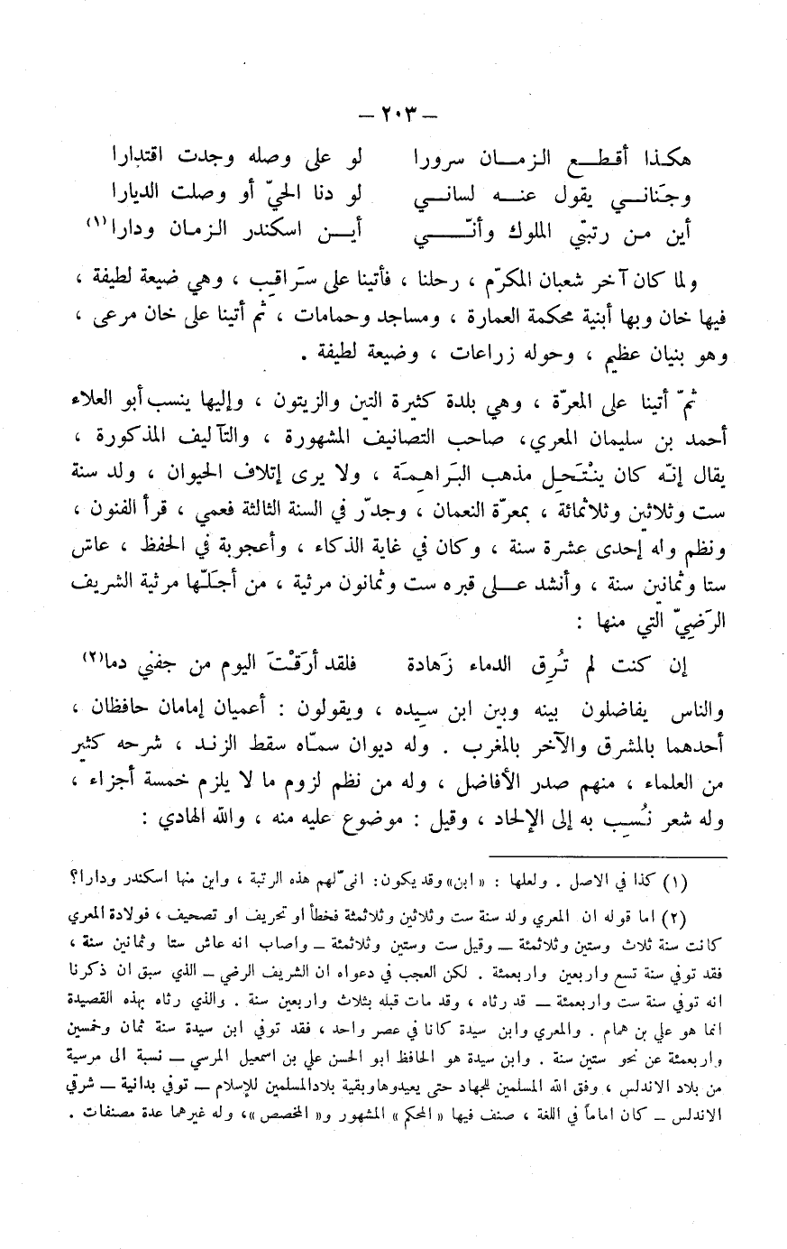 ثم أتينا على المعرَّة وهي بلدة كثيرة التين والزيتون، وإليها ينسب أبو العلاء أحمد بن عبد الله بن سليمان المعري صاحب التصانيف المشهورة والتآليف المذكورة، يقال إنه كان ينتحل مذهب البراهمة، ولا يرى إتلاف الحيوان، ولد سنة ثلاث وستين وثلاثمائة بمعرَّة النعمان، وجدّر في السنة الثالثة فعمي، قرأ الفنون ونظم
