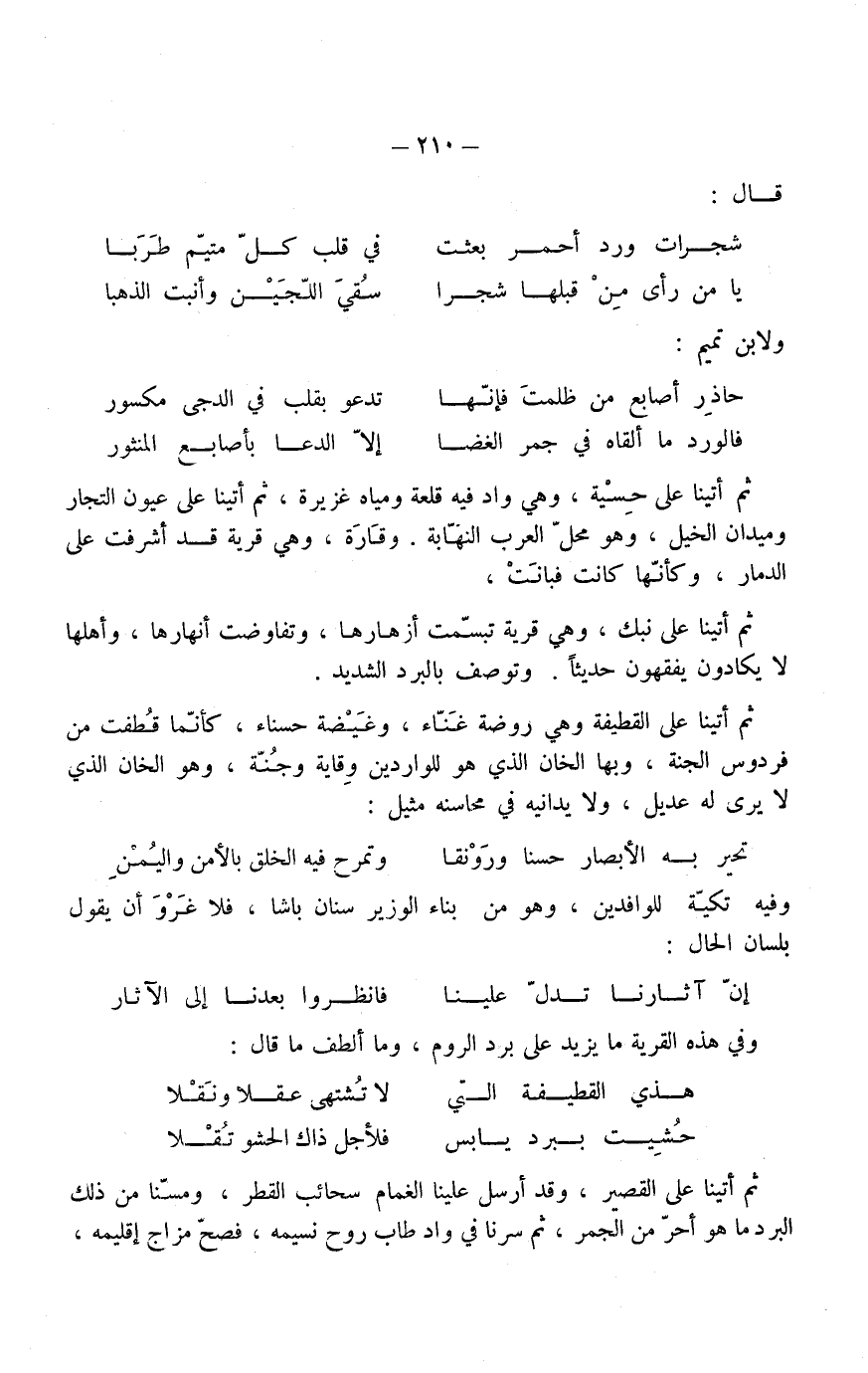 ثم أتينا على نبك وهي قرية تبسَّمت أزهارها، وتفاوضت أنهارها، وأهلها لا يكادون يفقهون حديثاً، وتوصف بالبرد الشديد. ثم أتينا على القطيفة وهي روضة غناء، وغَيْضة حسناء، كأنَّما قطفت من فردوس الجنة، وبها الخان الذي هو للواردين وِقاية وجُنَّة، وهو الخان الذي لا يرى له عديل، ولا يدانيه في محاسنه مثيل: