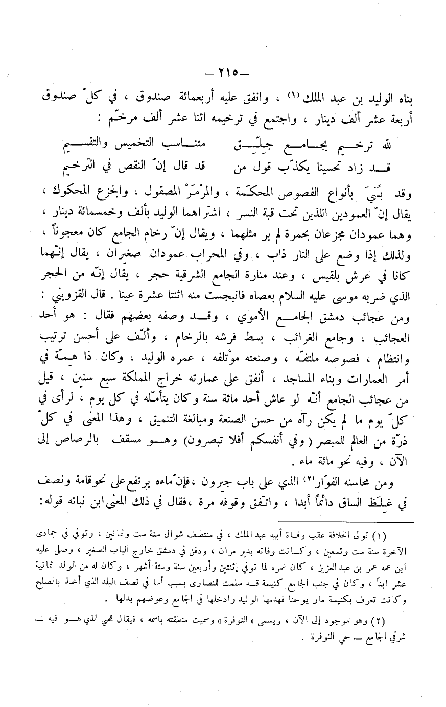 قال القزويني: ومن عجائب دمشق الجامع الأموي، وقد وصفه بعضهم فقال: هو أحد العجائب وجامع الغرائب، بسط فرشه بالرخام، وألّف على أحسن ترتيب وانتظام، فصوصه ملتفة، وصنعته مؤتلفه، عمّره الوليد، وكان ذا هِمّة في أمر العمارات وبناء المساجد، أنفق على عمارته خراج المملكة سبع سنين، قيل من عجائب الجامع إنه لو عاش أحد مائة سنة وكان يتأمّله في كلّ يوم، لرأى في كلّ يوم ما لم يكن رآه من حسن الصنعة، ومبالغة التنميق، وهذا المعنى في كلّ ذرة من العالم للمبصر وفي أنفسكم أفلا تبصرون وهو مسقف بالرصاص إلى الآن، وفيه نحو مائة ماء.