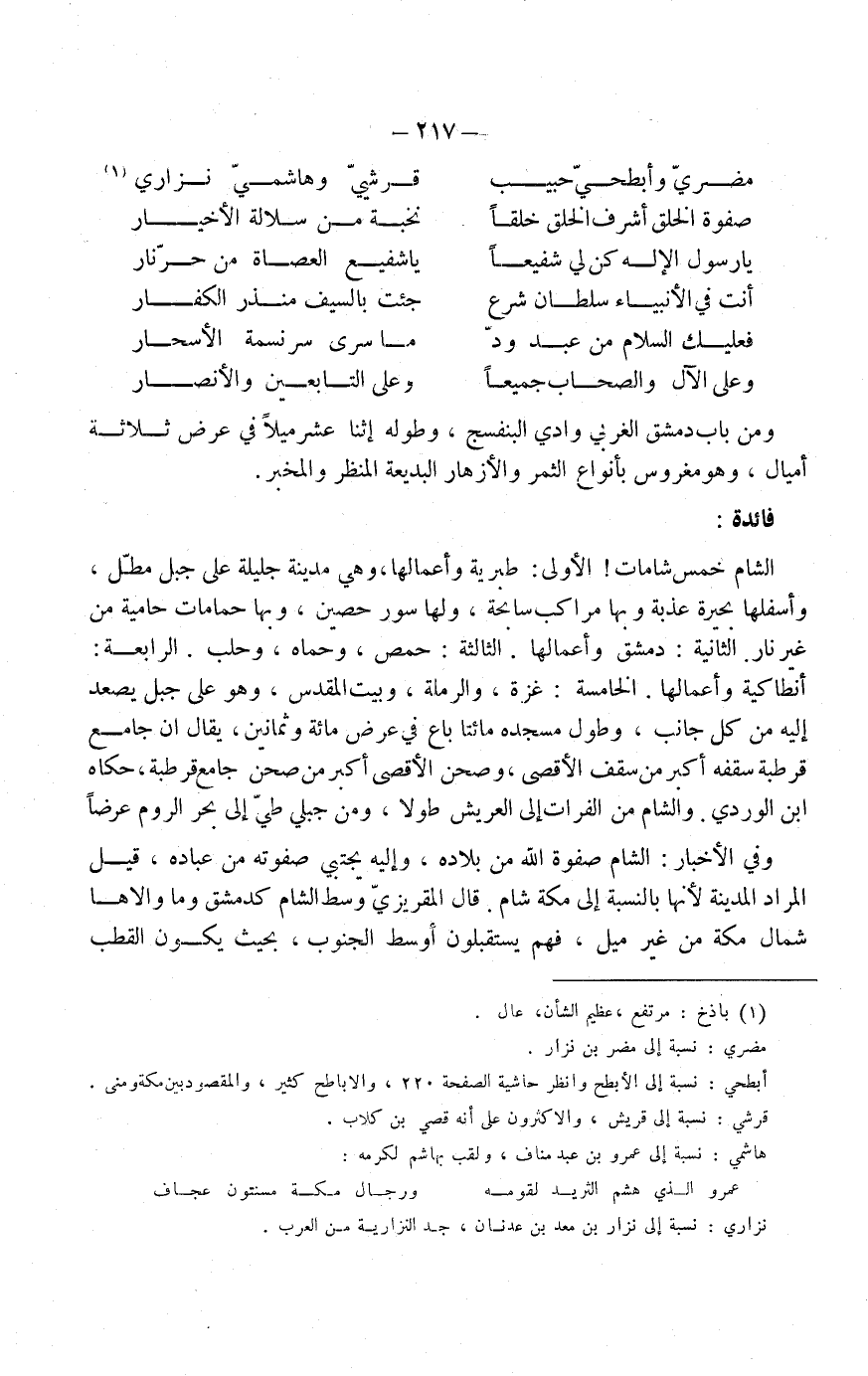 الشام خمس شامات: الأولى: طبرية وأعمالها، وهي مدينة جليلة على جبل مطل، وأسفلها بحيرة عذبة وبها مراكب سابحة، ولها سور حصين، وبها حمّامات حامية من غير نار. الثانية: دمشق وأعمالها. الثالثة: حمص، وحماة، وحلب. الرابعة: أنطاكية وأعمالها. الخامسة: غزة، والرملة، وبيت المقدس، وهو على جبل يصعد إليه من كلّ جانب، وطول مسجده مائتا باع في عرض مائة وثمانين.