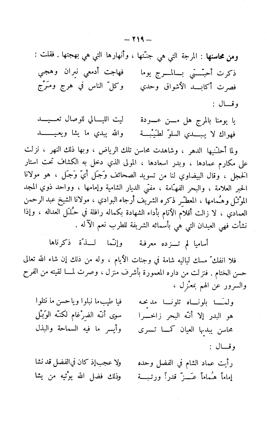 ولما أحلّنيها الدهر، وشاهدت محاسن تلك الرياض، وبها ذلك النهر، نزلت على مكارم عمادها، وبدر إسعادها، المولى الذي دخل به الكشاف تحت أستار الخجل،