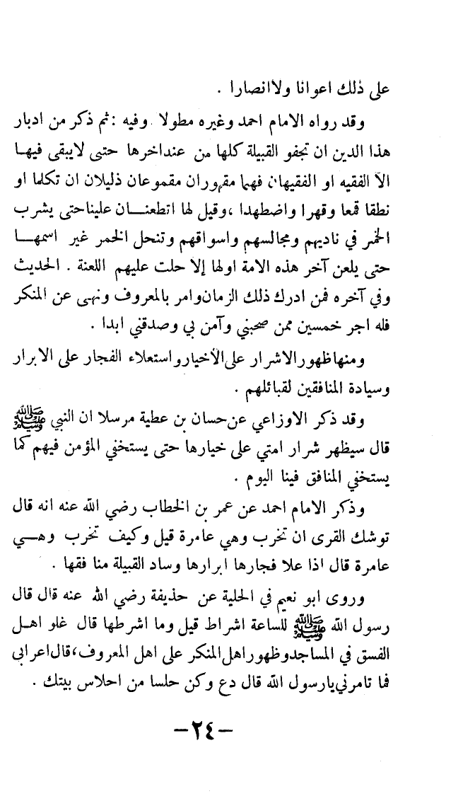وقد رواه الإمام أحمد وغيره مطولا، وفيه ثم ذكر من ادبار هذا الدين أن تجفو القبيلة كلها من عند آخرها, حتى لا يبقى فيها إلا الفقيه أو الفقيهان فهما مقهوران مقموعان ذليلان إن تكلما أو نطقا قمعًا وقهرًا واضطهدا، وقيل لهما أتطعنان علينا حتى يشرب الخمر في ناديهم ومجالسهم وأسواقهم وتنحل الخمر غير اسمها حتى يلعن آخر هذه الأمة أولها, إلا حلت عليهم اللعنة. الحديث. وفي آخره فمن أدرك ذلك الزمان وأمر بالمعروف ونهى عن المنكر فله أجر خمسين ممن صحبني وآمن بي وصدقني أبدًا.