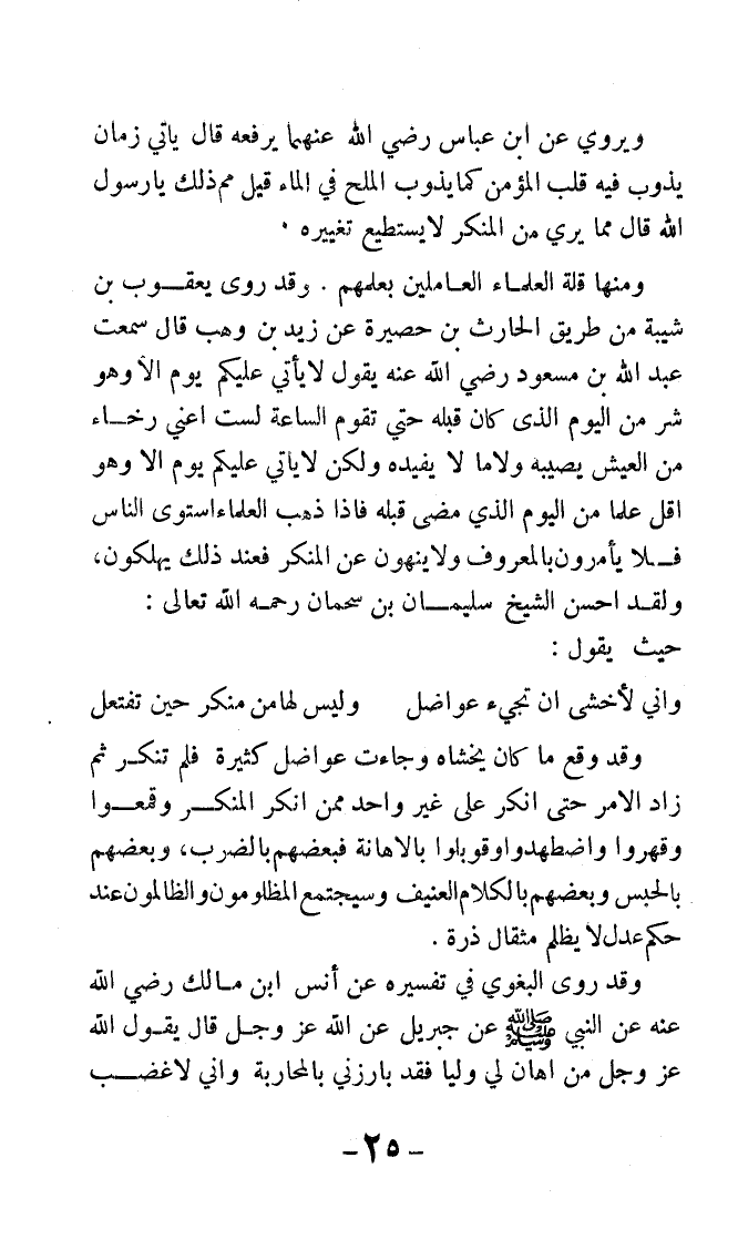 ومنها قلة العلماء العاملين بعلمهم. وقد روى يعقوب بن شيبة من طريق الحارث بن حصيرة عن زيد بن وهب، قال: سمعت عبد الله بن مسعود رضي الله عنه يقول: لا يأتي عليكم يوم إلا وهو شر من اليوم الذي كان قبله حتى تقوم الساعة, لست أعني رخاء من العيش يصيبه, ولا ما لا يفيده, ولكن لا يأتي عليكم يوم إلا وهو أقل علمًا من اليوم الذي مضى قبله، فإذا ذهب العلماء استوى الناس, فلا يأمرون بالمعروف, ولا ينهون عن المنكر, فعند ذلك يهلكون, ولقد أحسن الشيخ سليمان بن سحمان رحمه الله تعالى: