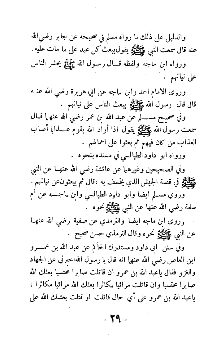 وفي الصحيحين وغيرهما عن عائشة رضي الله عنها عن النبي - صلى الله عليه وسلم - في قصة الجيش الذي يخسف به، قال: ثم يبعثون عن نياتهم, وروى مسلم أيضًا، وأبو داود الطيالسي وابن ماجة عن أم سلمة رضي الله عنها عن النبي - صلى الله عليه وسلم - نحوه.