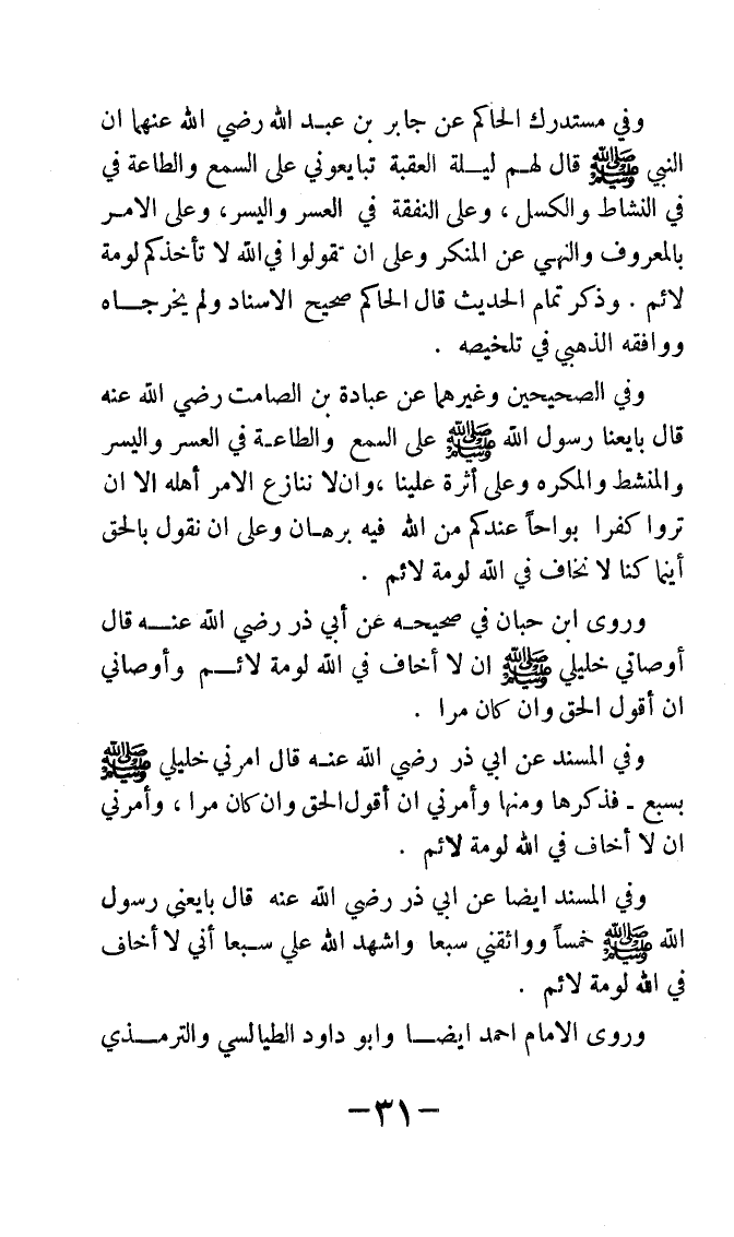 وفي مستدرك الحاكم عن جابر بن عبد الله رضي الله عنهما أن النبي - صلى الله عليه وسلم - قال لهم ليلة العقبة: «تبايعوني على السمع والطاعة في النشاط والكسل، وعلى النفقة في العسر واليسر، وعلى الأمر بالمعروف والنهي عن المنكر, وعلى أن تقولوا في الله لا تأخذكم لومة لائم» وذكر تمام الحديث قال الحاكم: صحيح الإسناد ولم يخرجاه ووافقه الذهبي في تلخيصه.