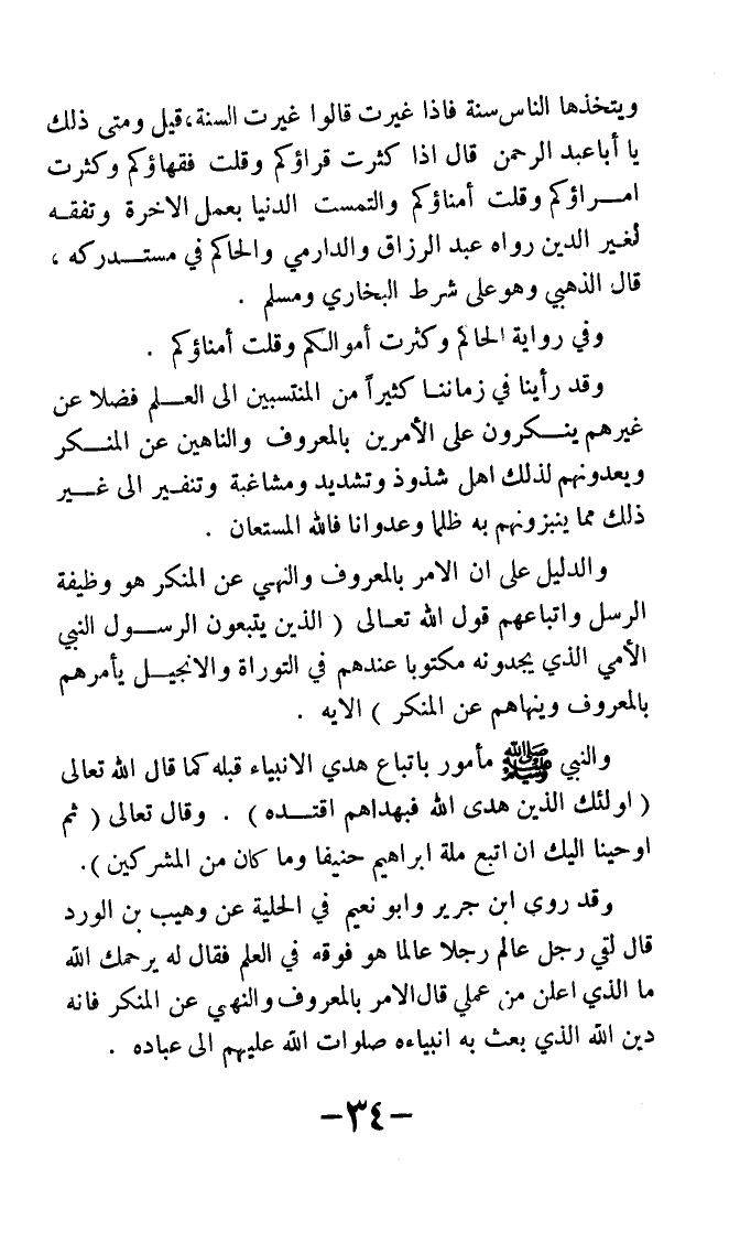 وقد روي ابن جرير وأبو نعيم في الحلية عن وهيب بن الورد, قال: لقي رجل عالم رجلا عالمًا هو فوقه في العلم, فقال له: يرحمك الله, ما الذي أعلن من عملي؟ قال: الأمر بالمعروف والنهي عن المنكر؛ فإنه دين الله الذي بعث به أنبياءه صلوات الله عليهم إلى عباده,