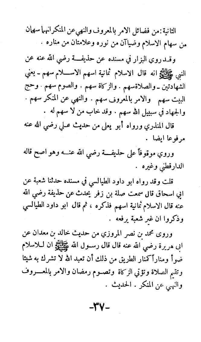 وقد روي البزار في مسنده عن حذيفة رضي الله عنه عن النبي - صلى الله عليه وسلم - أنه قال: «الإسلام ثمانية أسهم الإسلام سهم» يعني الشهادتين «والصلاة سهم, والزكاة سهم، والصوم سهم، وحج البيت سهم, والأمر بالمعروف سهم, والنهي عن المنكر سهم, والجهاد في سبيل الله سهم, وقد خاب من لا سهم له».
