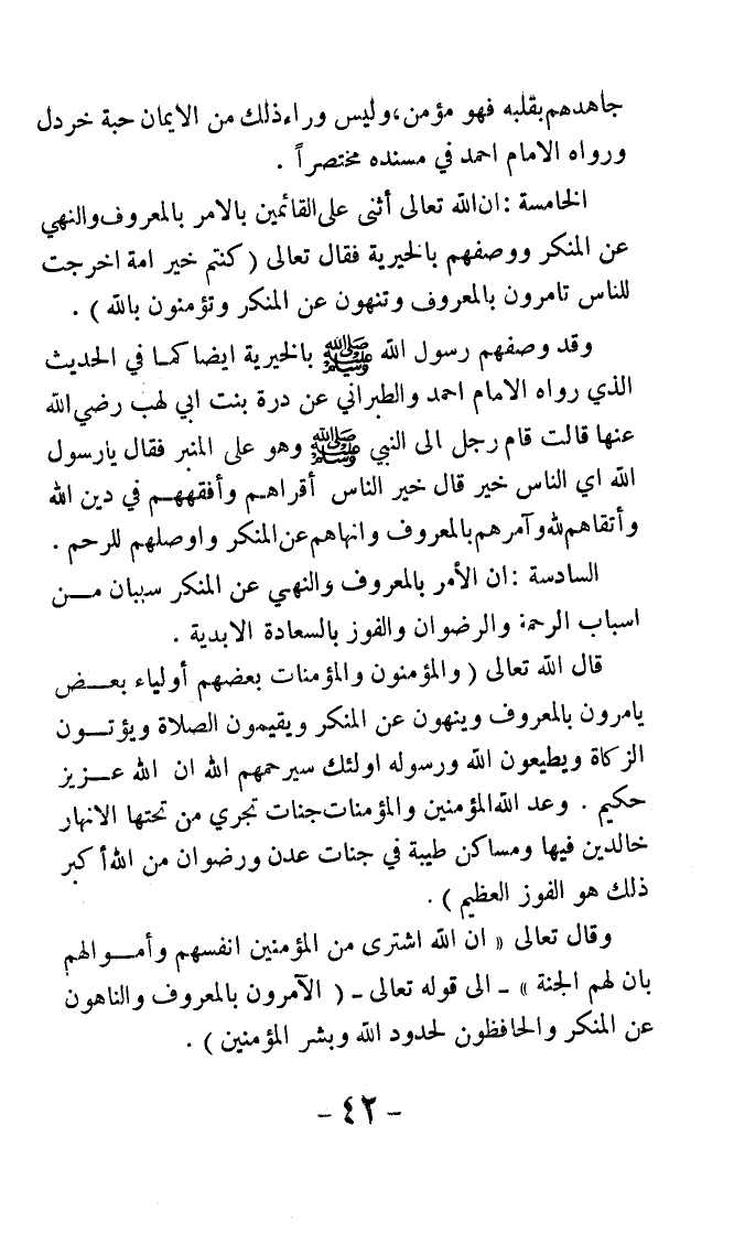 وقال تعالى: {إِنَّ اللَّهَ اشْتَرَى مِنَ الْمُؤْمِنِينَ أَنْفُسَهُمْ وَأَمْوَالَهُمْ بِأَنَّ لَهُمُ الْجَنَّةَ} إلى قوله تعالى: {الْآَمِرُونَ بِالْمَعْرُوفِ وَالنَّاهُونَ عَنِ الْمُنْكَرِ وَالْحَافِظُونَ لِحُدُودِ اللَّهِ وَبَشِّرِ الْمُؤْمِنِينَ}.