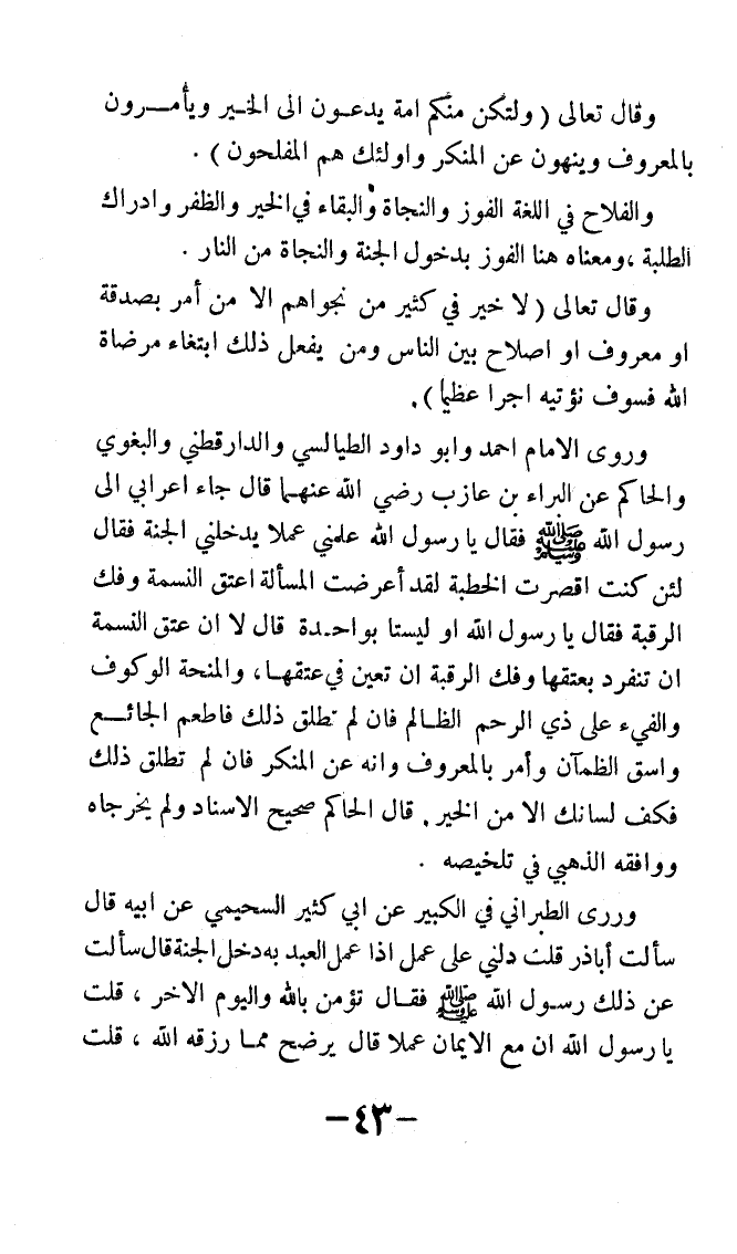 وروى الإمام أحمد وأبو داود الطيالسي والدارقطني والبغوي والحاكم عن البراء بن عازب رضي الله عنهما قال: جاء أعرابي إلى رسول الله - صلى الله عليه وسلم - فقال: يا رسول الله, علمني عملاً يدخلني الجنة. فقال: «لئن كنت أقصرت الخطبة لقد أعرضت المسألة أعتق النسمة، وفك الرقبة» فقال: يا رسول الله, أو ليستا بواحدة, قال: «لا؛ إن عتق النسمة أن تنفرد بعتقها, وفك الرقبة أن تعين في عتقها، والمنحة الوكوف والفيء على ذي الرحم الظالم, فإن لم تطق ذلك فأطعم الجائع, واسق الظمآن, وأمر بالمعروف, وانهَ عن المنكر, فإن لم تطق ذلك فكف لسانك إلا من الخير» قال الحاكم: صحيح الإسناد ولم يخرجاه ووافقه الذهبي في تلخيصه.