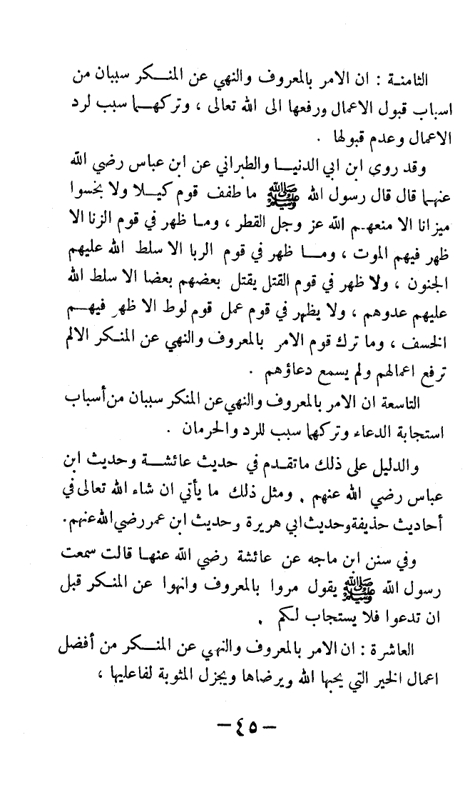 وقد روى ابن أبي الدنيا والطبراني عن ابن عباس رضي الله عنهما قال: قال رسول الله - صلى الله عليه وسلم -: «ما طفف قوم كيلا, ولا بخسوا ميزانًا إلا منعهم الله عز وجل القطر، وما ظهر في قوم الزنى إلا ظهر فيهم الموت، وما ظهر في قوم الربا إلا سلط الله عليهم الجنون، ولا ظهر في قوم القتل يقتل بعضهم بعضًا إلا سلط الله عليهم عدوهم، ولا يظهر في قوم عمل قوم لوط إلا ظهر فيهم الخسف، وما ترك قوم الأمر بالمعروف والنهي عن المنكر إلا لم ترفع أعمالهم, ولم يسمع دعاؤهم».
