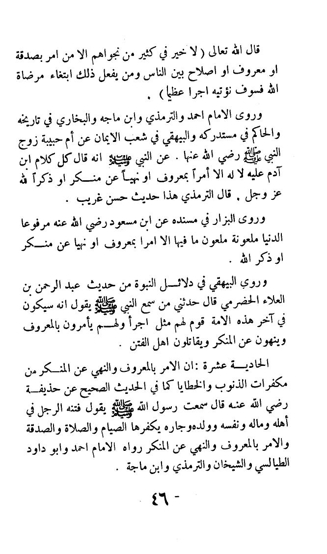 وروى الإمام أحمد والترمذي وابن ماجة والبخاري في تاريخه والحاكم في مستدركه والبيهقي في شعب الإيمان عن أم حبيبة زوج النبي - صلى الله عليه وسلم - رضي الله عنها، عن النبي - صلى الله عليه وسلم - أنه قال: «كل كلام ابن آدم عليه, لا له, إلا أمرًا بمعروف أو نهيًا عن منكر أو ذكر لله عز وجل». قال الترمذي: هذا حديث حسن غريب.