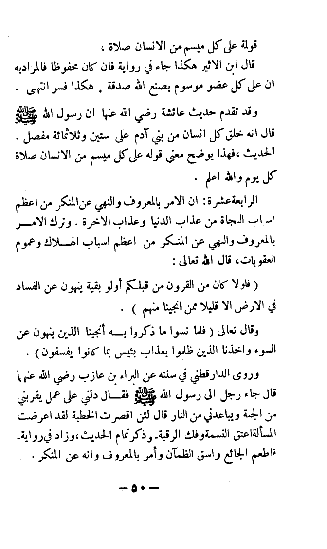 وروى الدارقطني في سننه عن البراء بن عازب رضي الله عنهما قال: جاء رجل إلى رسول الله - صلى الله عليه وسلم - فقال: دلني على عمل يقربني من الجنة, ويباعدني من النار قال: «لئن اقصرت الخطبة لقد اعرضت المسألة اعتق النسمة وفك الرقبة» وذكر تمام الحديث، وزاد في رواية: «فاطعم الجائع واسق الظمآن وأمر بالمعروف وانه عن المنكر».