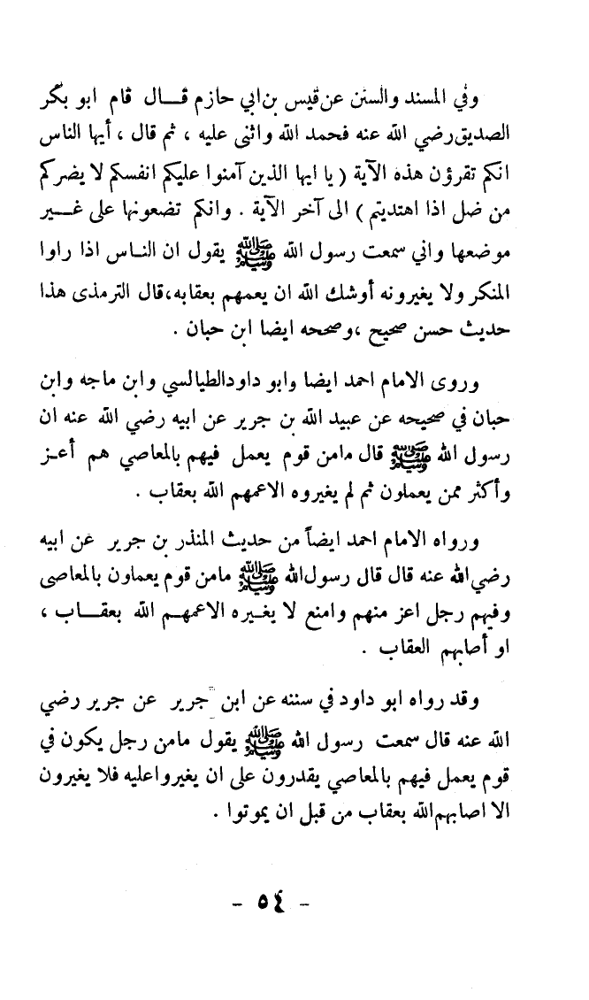 وفي المسند والسنن عن قيس بن أبي حازم قال: قام أبو بكر الصديق رضي الله عنه فحمد الله وأثنى عليه، ثم قال: أيها الناس, إنكم تقرءون هذه الآية: {يَا أَيُّهَا الَّذِينَ آَمَنُوا عَلَيْكُمْ أَنْفُسَكُمْ لَا يَضُرُّكُمْ مَنْ ضَلَّ إِذَا اهْتَدَيْتُمْ} إلى آخر الآية. وإنكم تضعونها على غير موضعها, وإني سمعت رسول الله - صلى الله عليه وسلم - يقول: «إن الناس إذا رأوا المنكر, ولا يغيرونه أوشك الله أن يعمهم بعقابه». قال الترمذي: هذا حديث حسن صحيح، وصححه أيضًا ابن حبان.