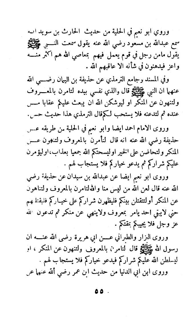 وفي المسند وجامع الترمذي عن حذيفة بن اليمان رضي الله عنهما أن النبي - صلى الله عليه وسلم - قال: «والذي نفسي بيده لتأمرن بالمعروف, ولتنهون عن المنكر, أو ليوشكن الله أن يبعث عليكم عقابًا من عنده, ثم لتدعنه فلا يستحب لكم». قال الترمذي: هذا حديث حسن.