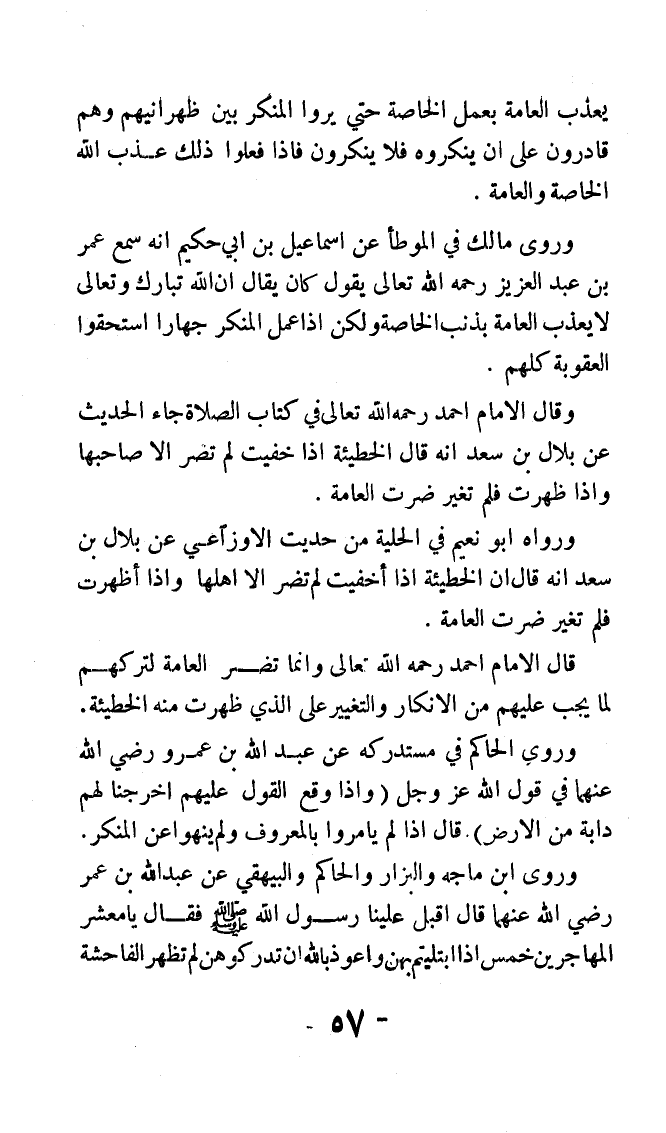 وروى مالك في الموطأ عن إسماعيل بن أبي حكيم أنه سمع عمر بن عبد العزيز رحمه الله تعالى يقول: كان يقال: إن الله تبارك وتعالى لا يعذب العامة بذنب الخاصة, ولكن إذا عمل المنكر جهارًا استحقوا العقوبة كلهم.