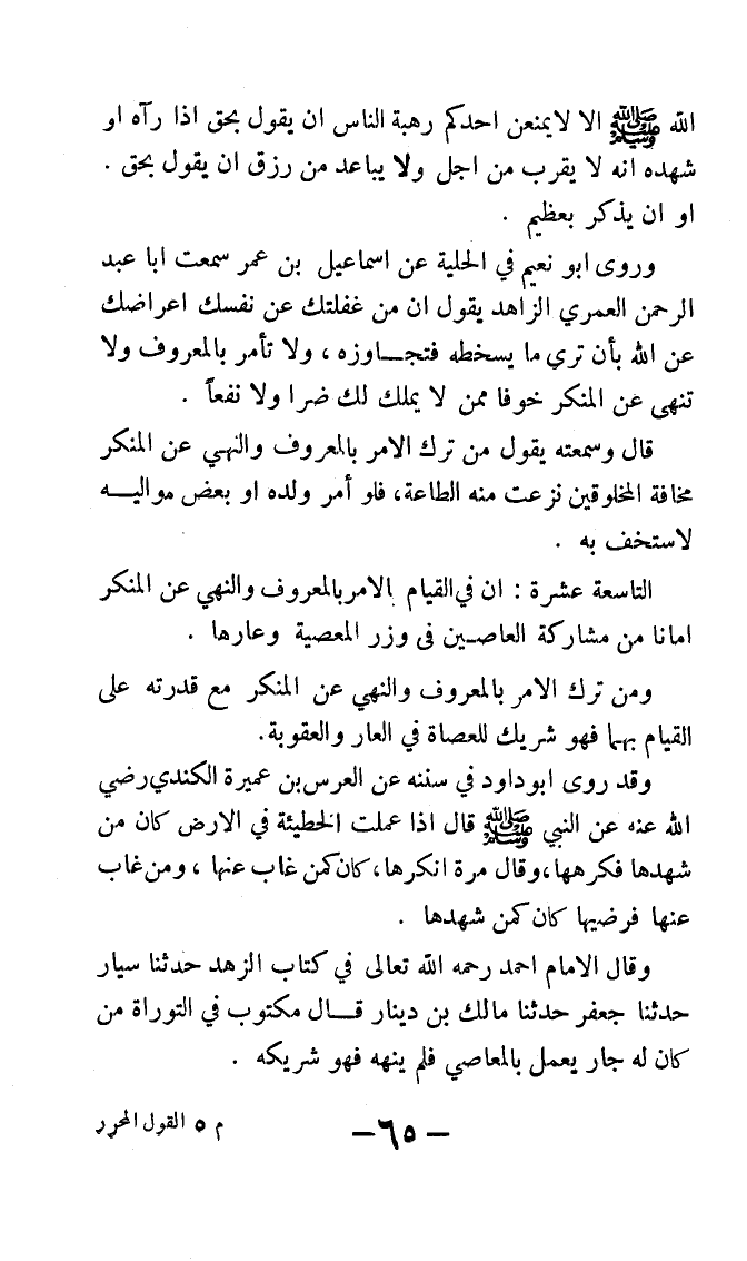 وروي أبو نعيم في الحلية عن إسماعيل بن عمر سمعت أبا عبد الرحمن العمري الزاهد يقول: إن من غفلتك عن نفسك إعراضك عن الله بأن ترى ما يسخطه فتجاوزه، ولا تأمر بالمعروف, ولا تنهى عن المنكر خوفًا ممن لا يملك لك ضرًا, ولا نفعًا.