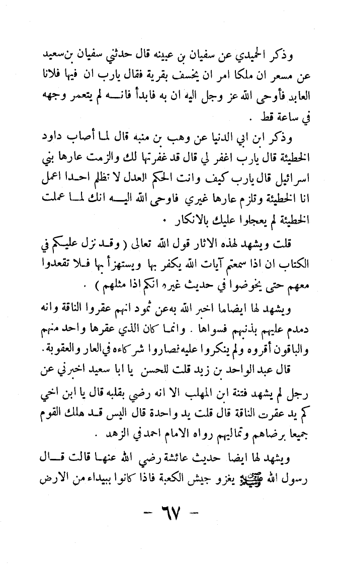 وذكر الحميدي عن سفيان بن عيينة قال: حدثني سفيان بن سعيد عن مسعر، أن ملكًا أمر أن يخسف بقرية, فقال: يا رب, إن فيها فلانًا العابد, فأوحى الله عز وجل إليه أن به فابدأ؛ فإنه لم يتمعر وجهه في ساعة قط.