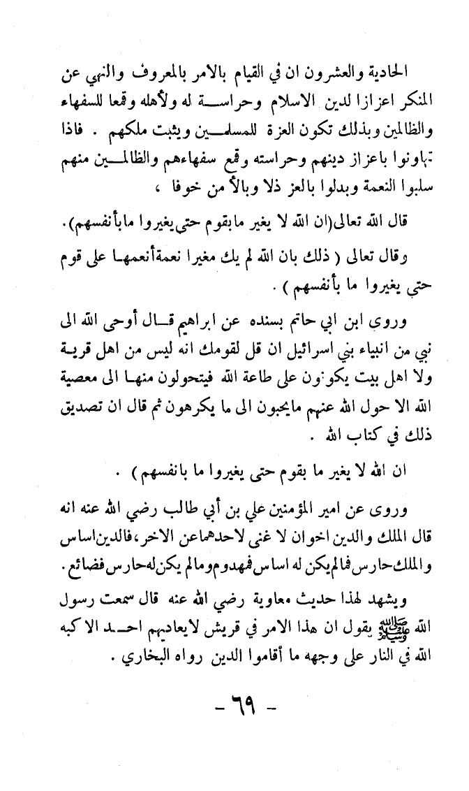 وقال تعالى: {ذَلِكَ بِأَنَّ اللَّهَ لَمْ يَكُ مُغَيِّرًا نِعْمَةً أَنْعَمَهَا عَلَى قَوْمٍ حَتَّى يُغَيِّرُوا مَا بِأَنْفُسِهِمْ}.